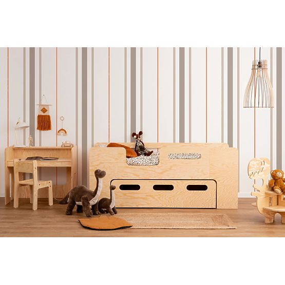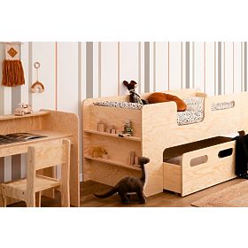 Das natürliche Bett Thomas mit Schublade ist eine geeignete Wahl für das Kinderzimmer. Dank seines zeitlosen und originellen Designs kann es mit verschiedenfarbigen Accessoires kombiniert werden. Die Schublade bietet nicht nur Stauraum, sondern kann auch als kleines Bett genutzt werden.