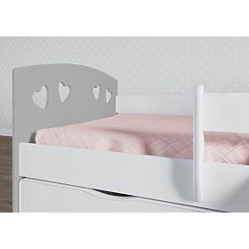 Ein schönes und modernes Bett mit Schutzbarriere in einer sanften Farbkombination aus Weiß und Hellgrau, verziert mit ausgeschnittenen Herzen, ist dank dieser Eigenschaften ideal für das Kinderzimmer von Mädchen.