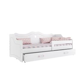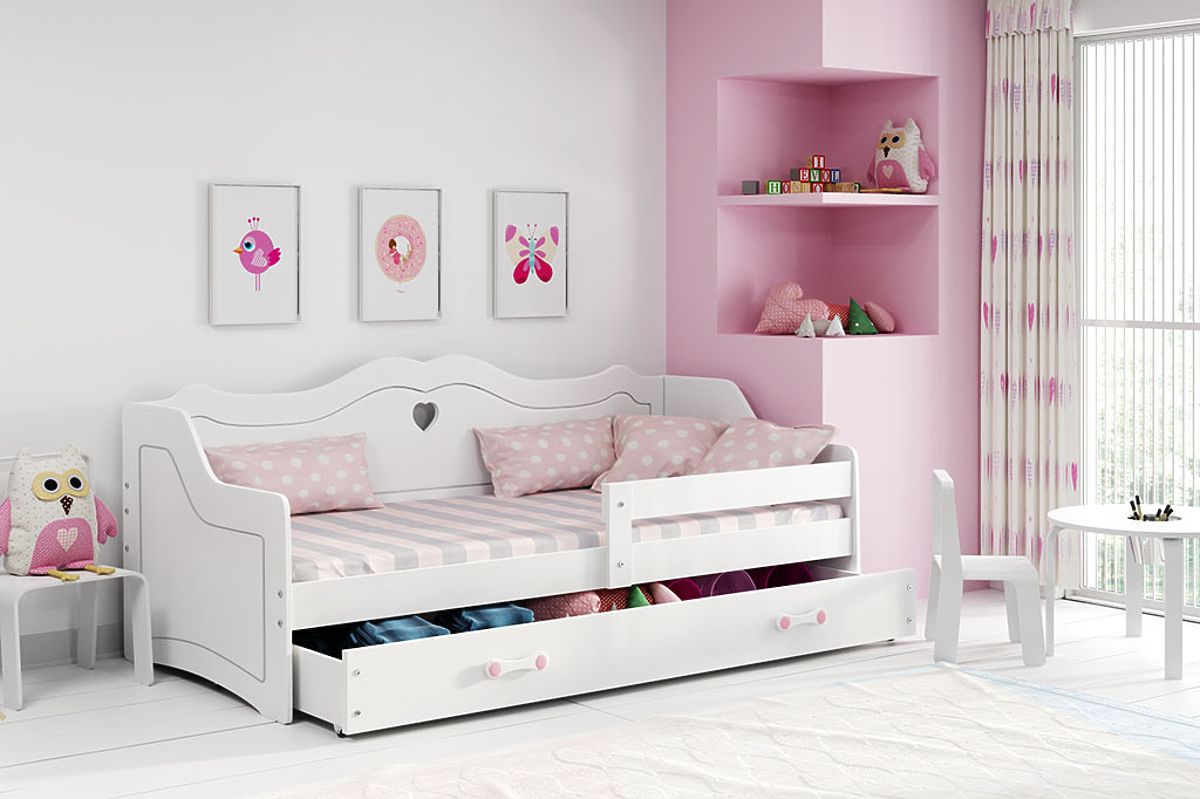Stylisches Julie Babybett in Weiß. Erhöhte Rücken und Seiten. Das Bett fügt sich durch sein Design in das Zimmer des Mädchens ein. Tagsüber dient es als Sofa (Couch), nachts als Bett. Dank der Betthalterung ist es auch für kleine Kinder bestens geeignet. Praktischer Stauraum inklusive.