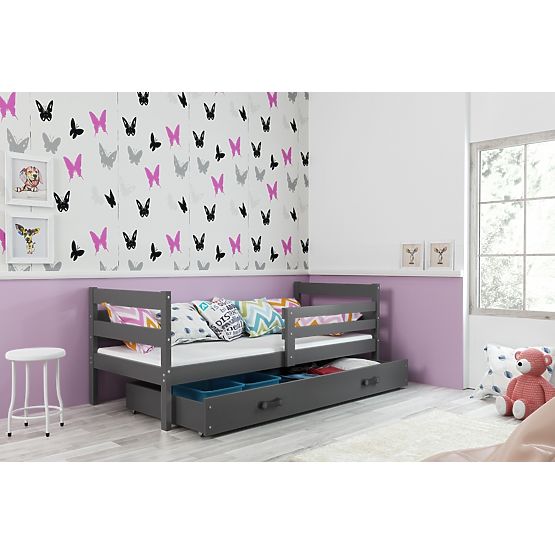 Einfaches Bett Erik fürs Kinderzimmer, in grauer Farbe mit Schublade und Rausfallschutz.
