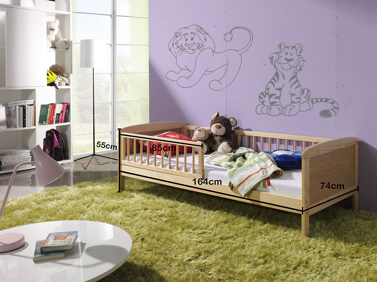 Der natürliche Farbton des Kiefernholzes unterstreicht die Reinheit und Eleganz des Kinderzimmers, ohne sich dabei besonders anstrengen zu müssen. Das Kinderbett in der Größe 160x70 cm ist geeignet für ein bequemes Schlafen von Kindern bis zu einer Größe von 140 cm. Das Bett in dieser Ausführung ist in Kombination mit der gepressten Platte geradezu bezaubernd.