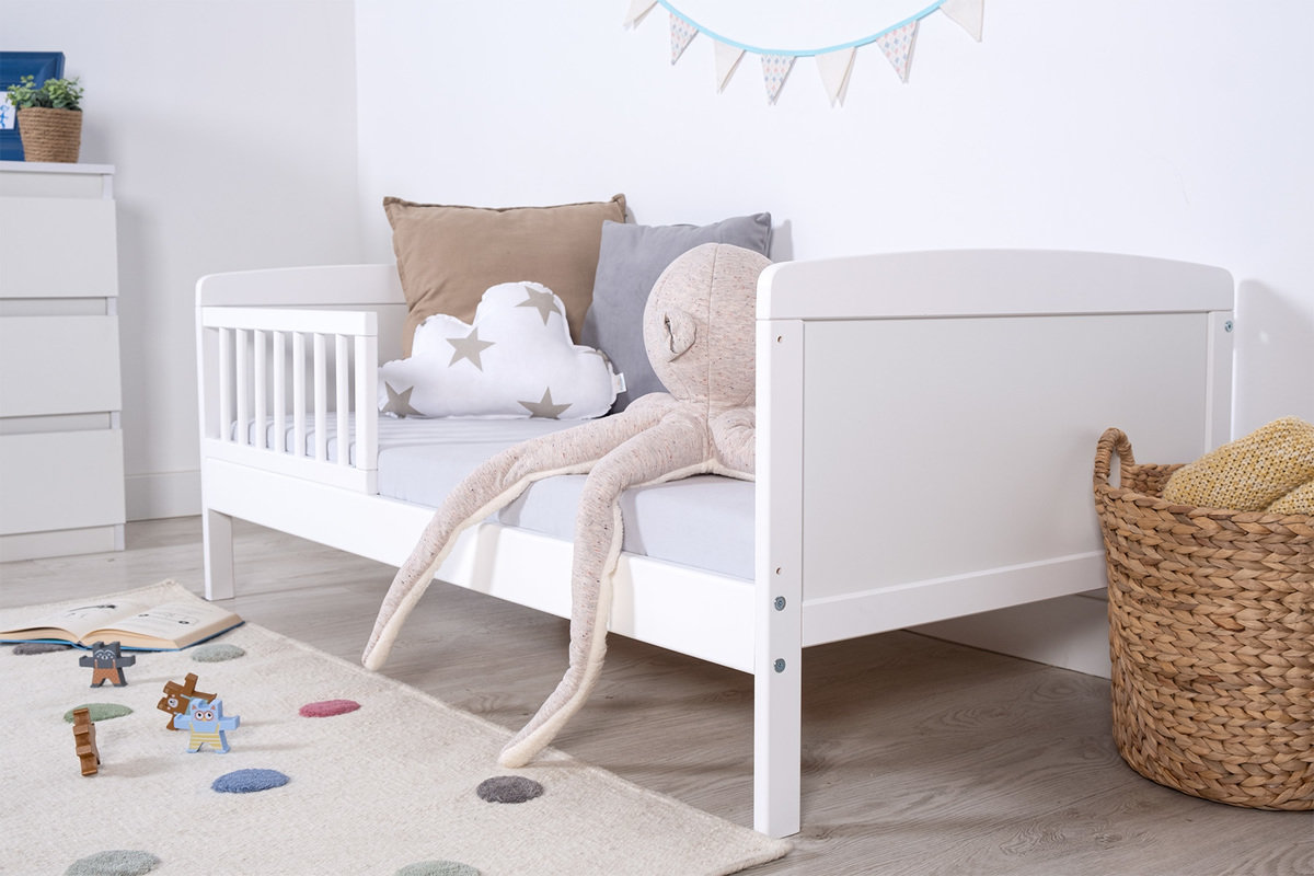 Kinderbett mit Schutzgitter, in der Farbe Weiß aus Kiefernholz + Kombination aus Pressplatte. Das Bett enthält einen Lattenrost aus Holz. Alle scharfen Kanten am Bett sind abgerundet, um die Sicherheit jedes Kindes zu gewährleisten. Das Bett verfügt über eine Rückleiste und ein Seitenschutzgitter.