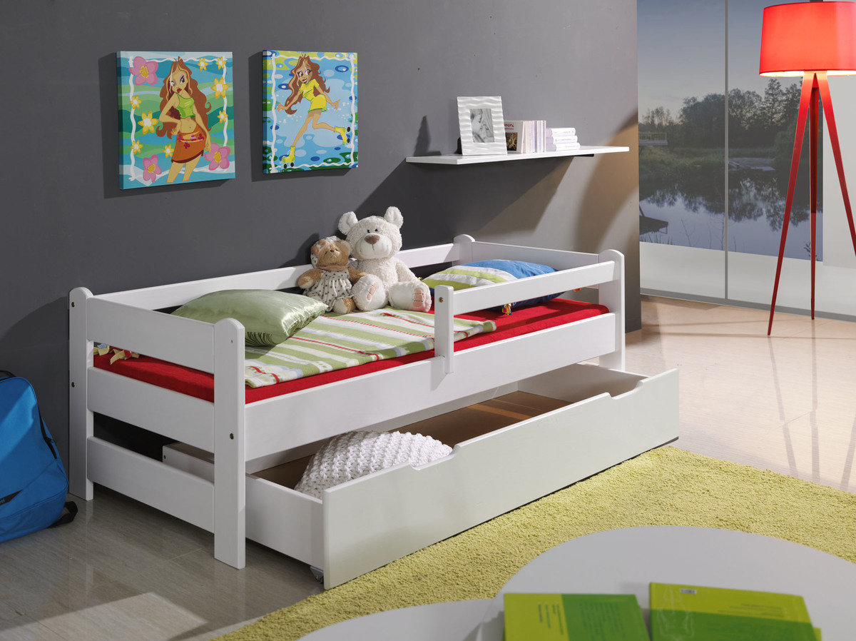 Das weiße Kinderbett Woody mit Schutzgitter gehört zu den bewährten Stücken der Kindermöbel für das Kinderzimmer. Weiße Farbe, massives Kiefernholz, beidseitiges Schutzgitter. Dies sind die Vorteile, die auch Ihnen dieses Bett gefallen lassen. Gleichzeitig haben Sie die Möglichkeit, eine Variante mit oder ohne Schublade zu wählen.