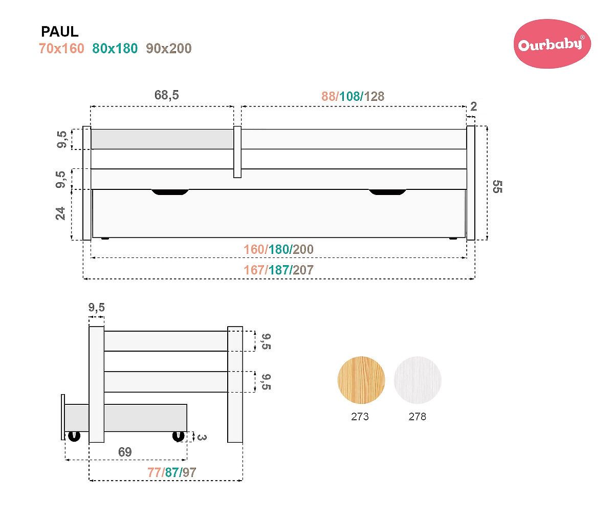 Sicherheit ist bei Kinderbetten von entscheidender Bedeutung, weshalb dieser Bettentyp mit zwei Barrieren ausgestattet ist. Die Rückenbarriere über die gesamte Länge des Bettes schützt das Kind vor Stürzen oder vor Verschmutzung der angrenzenden Wand. Der vordere Rausfallschutz kann an beiden Seiten des Bettes montiert werden. Der Spalt zum bequemen Verlassen des Bettes ist breit genug (ca. 70 cm).
