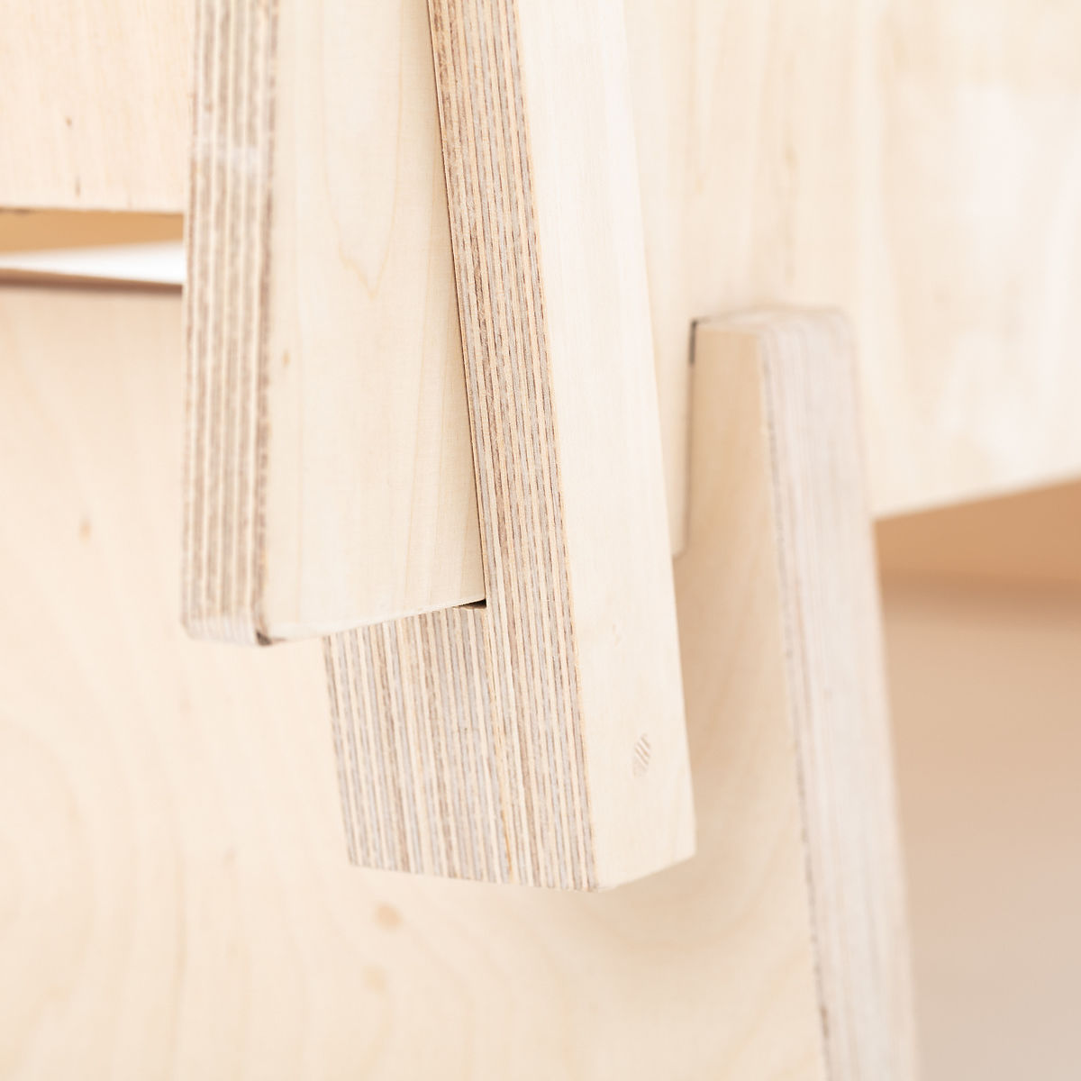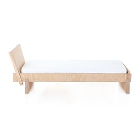 Das Holzbett TEN DEGREE zeichnet sich durch leicht abgeschrägte Formen von Beinen, Kopfteilen und Barrieren aus.