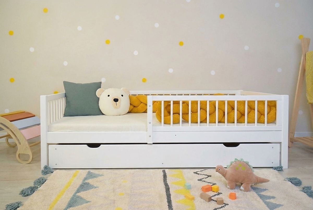Das stilvolle und praktische Kinderbett Teddy in elegantem Weiß bietet Ihrem Kind einen sicheren und bequemen Schlaf. Das Bett ist mit einer zertifizierten ökologischen Farbe lackiert, die für die Verwendung bei Möbeln zugelassen ist. Die robuste Konstruktion bietet eine lange Lebensdauer und dank des durchdachten Designs ist das Bett nicht nur sicher, sondern auch funktional. Es fügt sich leicht in jedes Kinderzimmer ein.