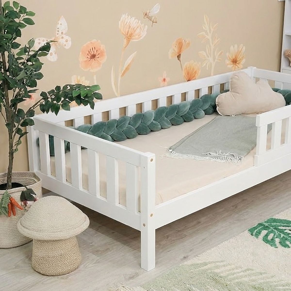 Modernes Montessori-Kinderbett Meadow in Weiß ist nach den Montessori-Prinzipien entworfen, die die Selbstständigkeit und natürliche Entwicklung des Kindes fördern. Dank der Konstruktion auf Füßen wirkt das Bett luftig und bietet gleichzeitig praktische Nutzungsmöglichkeiten des Stauraums unter dem Bett. Das Bett bietet einen sicheren und bequemen Ort zum Schlafen, Ausruhen und täglichen Spielen. Die grüne Ausführung wirkt frisch und verspielt und belebt jedes Kinderzimmer.
