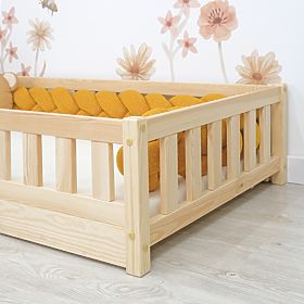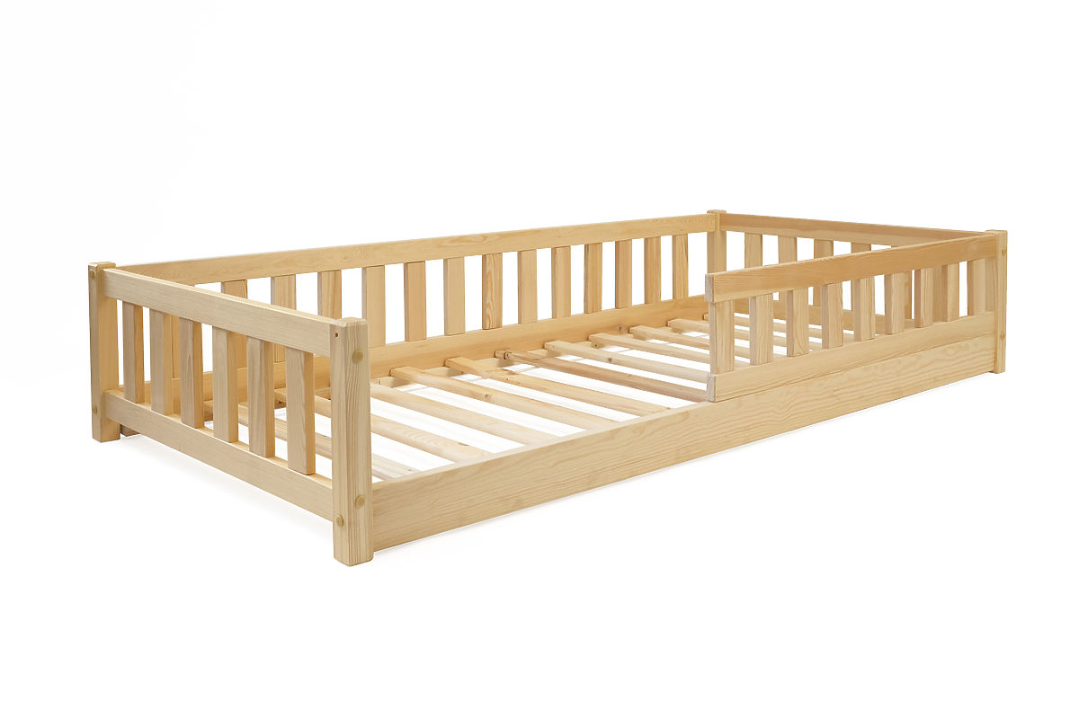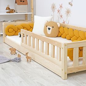 Niedriges Montessori-Kinderbett aus Kiefernholz mit Schutzbarriere. .. mehr
