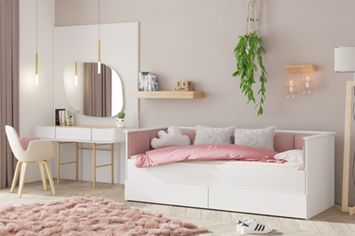 Ausziehbares Jugendbett HELIOS mit rosa Samt-Paneelen und geräumigen Schubladen. .. mehr