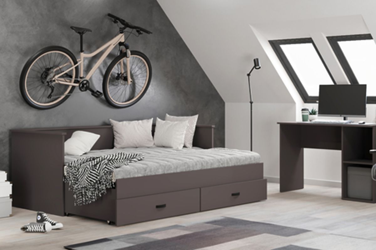 Das Modell HELIOS ist eine Lösung, die Funktionalität und Ästhetik in den Vordergrund stellt. Zusammengeklappt dient das Bett als bequeme Couch, was Platz spart und tagsüber eine gemütliche Atmosphäre schafft. Zwei geräumige Schubladen auf Kugellaufschienen ermöglichen die Aufbewahrung von Bettwäsche, Kleidung oder anderen Kleinigkeiten und helfen, Ordnung im Zimmer zu halten. Die Konstruktion aus strapazierfähiger Möbelplatte mit einer Dicke von 18 mm und einem Rahmen aus Birkenlatten garantiert Stabilität, Langlebigkeit und Komfort in der Nutzung. Diese Variante ermöglicht die Auswahl von Matratzen nach eigenen Vorlieben, sodass jeder sie an individuelle Bedürfnisse anpassen kann.
