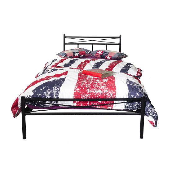 Moderne Metall Bett mit robusten Konstruktion und minimalistisches Design. Das Bett hat einen schönen Head, geometrische Design, das in die Kind oder Schüler Räume passt. Seine Anwendung findet jedoch auch in das eheliche Schlafzimmer.