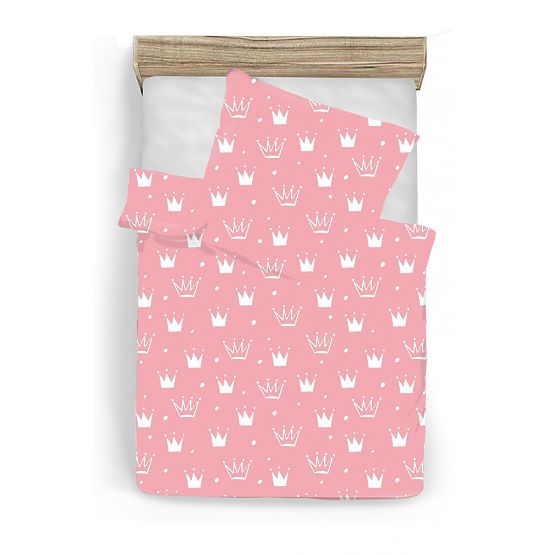 Wunderschöne Kinderbettwäsche mit Kronenmotiv, geeignet für kleine Prinzessinnen im Mädchenzimmer. Die Bettwäsche besteht aus hochwertigem Material und 100 % Baumwolle.