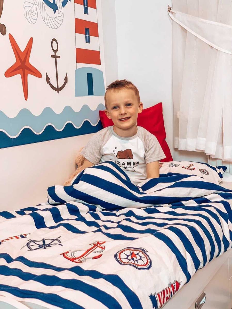 Wunderschöne stilvolle Bettwäsche Námořníček Matějovský! Die einfallsreiche maritime Bettwäsche für das Kinderbett NÁMOŘNÍČEK bietet die perfekte Kombination aus reinem Weiß und Dunkelblau, ergänzt durch verspielte maritime Dekore in leuchtendem Rot.