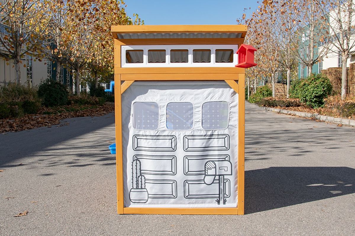 Innovatives Holzspielhaus mit schrägem Dach und Garagentor. .. mehr