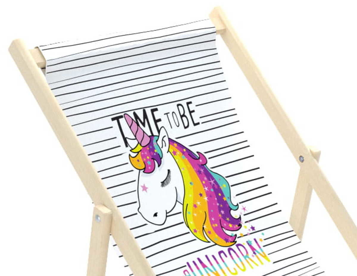 Eine wunderschöne Strandliege mit zauberhaftem Einhornmuster. Der Liegestuhl ist mit einer lustigen englischen Aufschrift „TIME TO BE UNICORN“ verziert. Eine Kinder-Strandliege ist eine tolle Alternative zu einem Gartenstuhl oder Sessel.