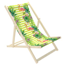 Schöner Strandkorb mit Flamingomuster und tropischen Blumen. Der Stoff hat eine schöne grüne Farbe mit weißen Streifen. Ein Kinderstrandkorb ist eine tolle Alternative zu einem Gartenstuhl oder Sessel.