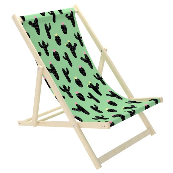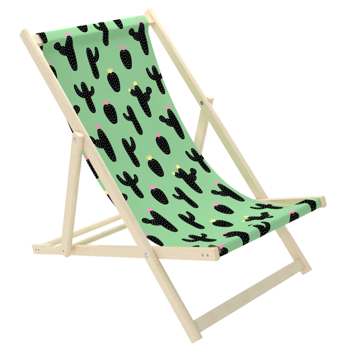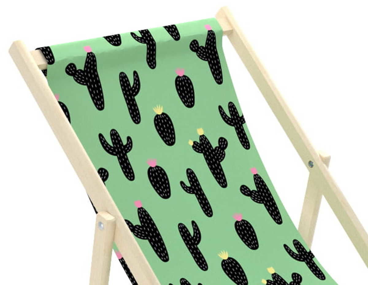 Eine wunderschöne Strandliege mit Kaktusmuster. Der Stoff hat eine schöne grüne Farbe. Eine Kinder-Strandliege ist eine tolle Alternative zu einem Gartenstuhl oder Sessel.