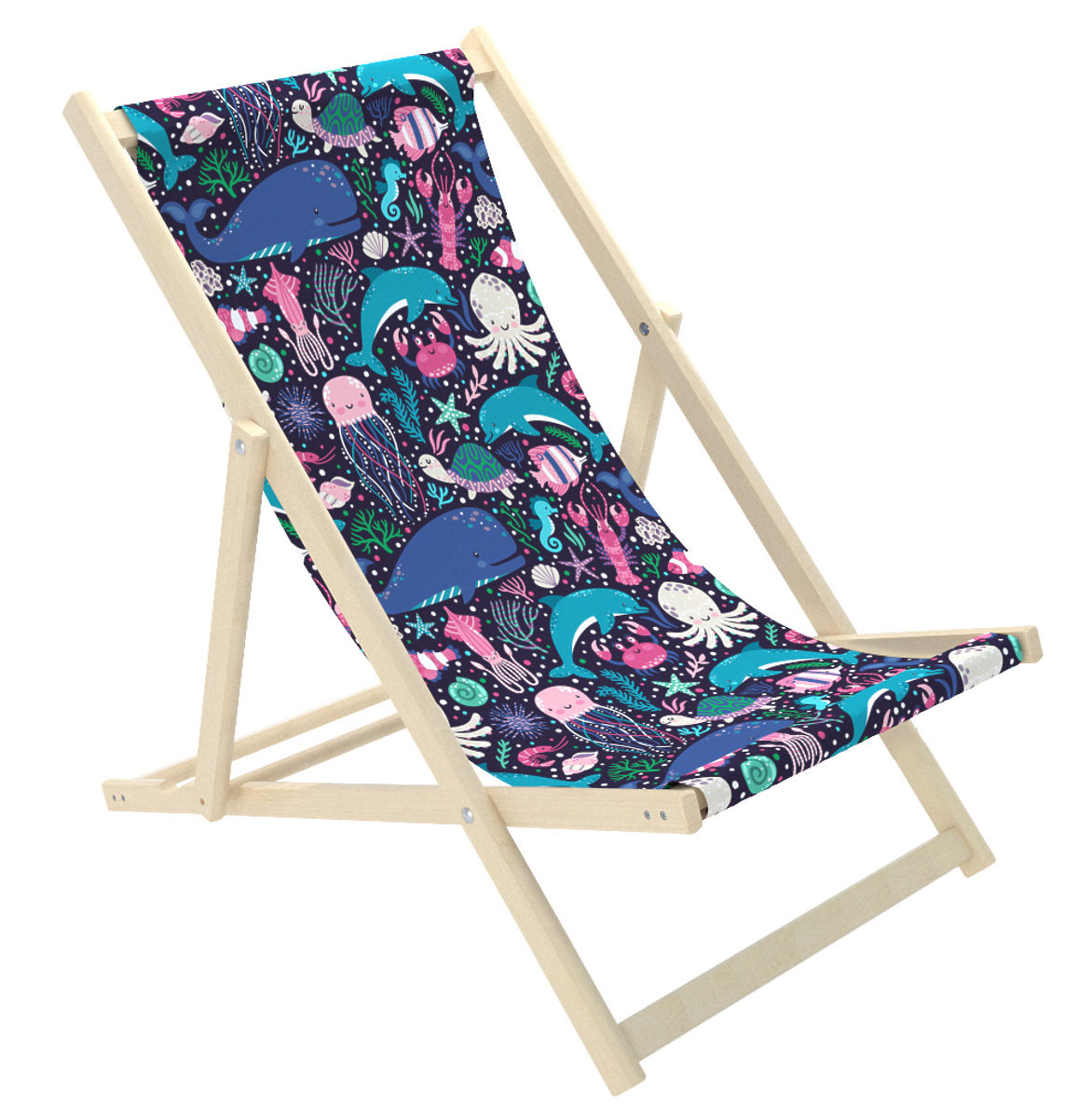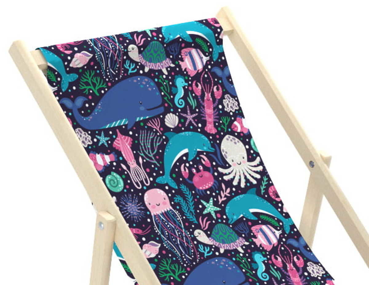 Eine wunderschöne Strandliege mit einem Muster aus Meerestieren. Der Stoff hat eine wunderschöne dunkle Farbe und strahlt die Schönheit des Unterwasserlebens aus. Eine Kinder-Strandliege ist eine tolle Alternative zu einem Gartenstuhl oder Sessel.
