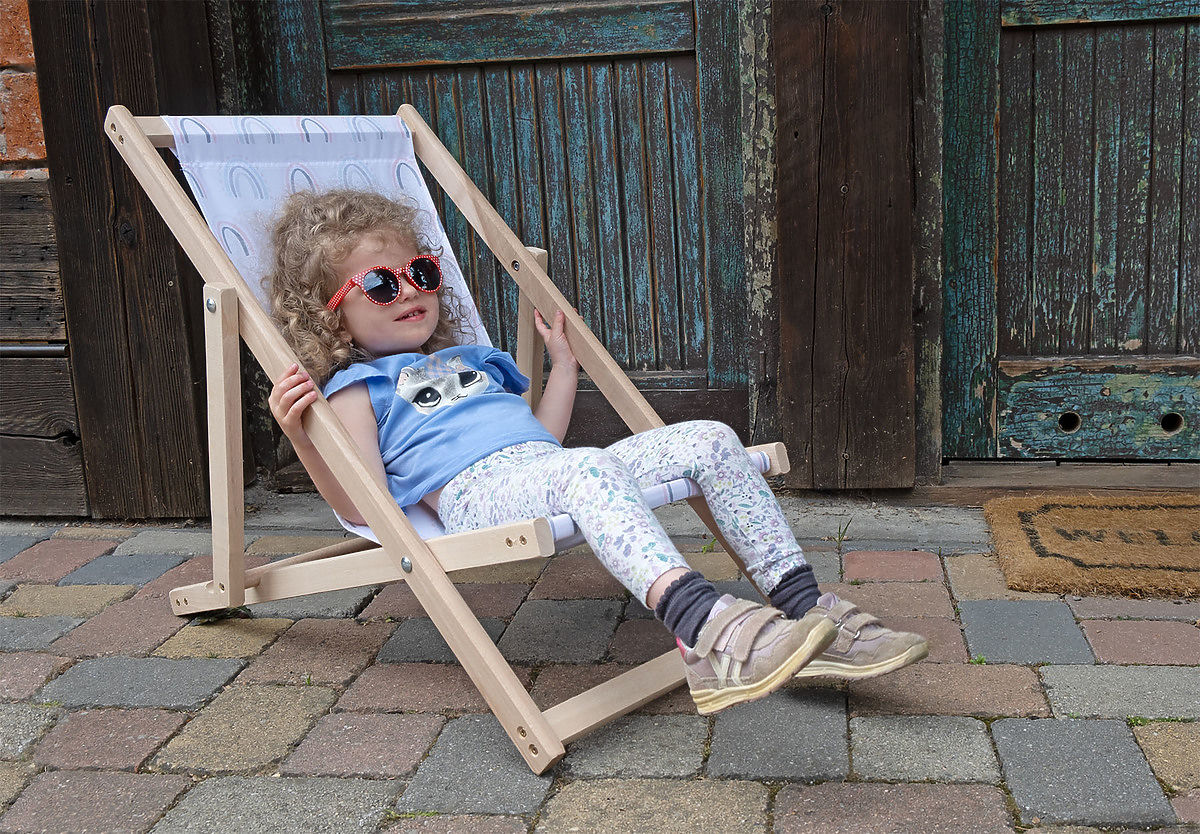 Die Buchenlatten, aus denen die Struktur besteht, sind glatt geschliffen und gefräst, damit sich Kinder nicht verletzen können. Sie können die Liege einfach und schnell zusammenklappen und transportieren.