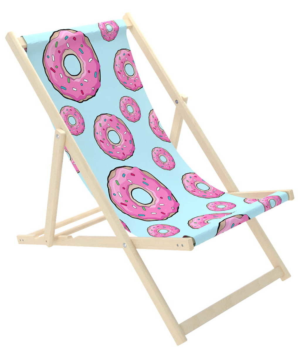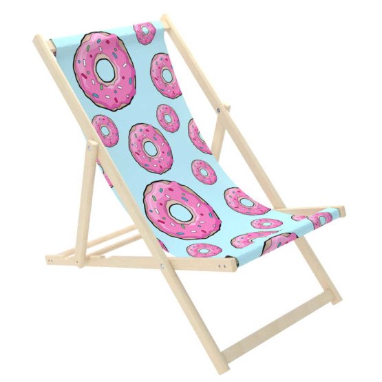Schöner blauer Strandkorb mit einem Muster der amerikanischen Donuts mit rosa Zuckerguss und bunten Streuseln. Das süße Donut-Motiv der Liege ist perfekt für sommerlichen Komfort. Der Liegestuhl ist für das Meer und den Garten geeignet. Ein Strandkorb für Erwachsene ist eine großartige Alternative zu einem Gartenstuhl oder Sessel.