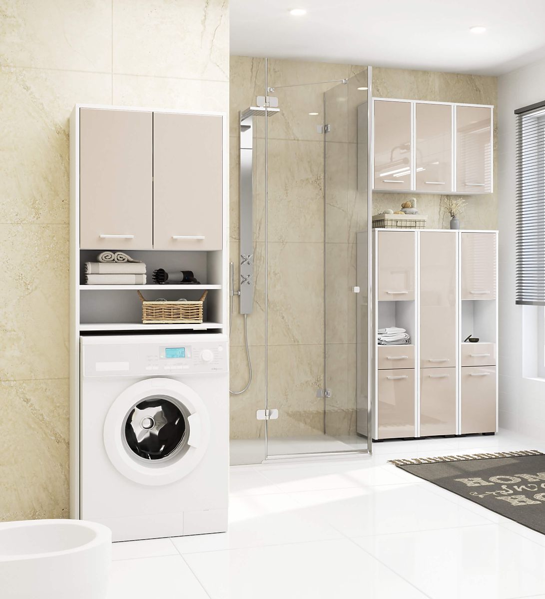 Banaby.de » Kindermöbel / Kinderkommoden und Schränke / Kinderkleiderschränke / Badezimmerschrank FIN über Waschmaschine - Weiß-Cappuccino Glanz - 2 Türen