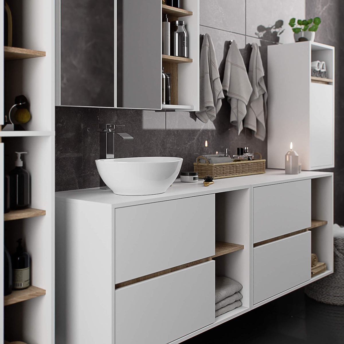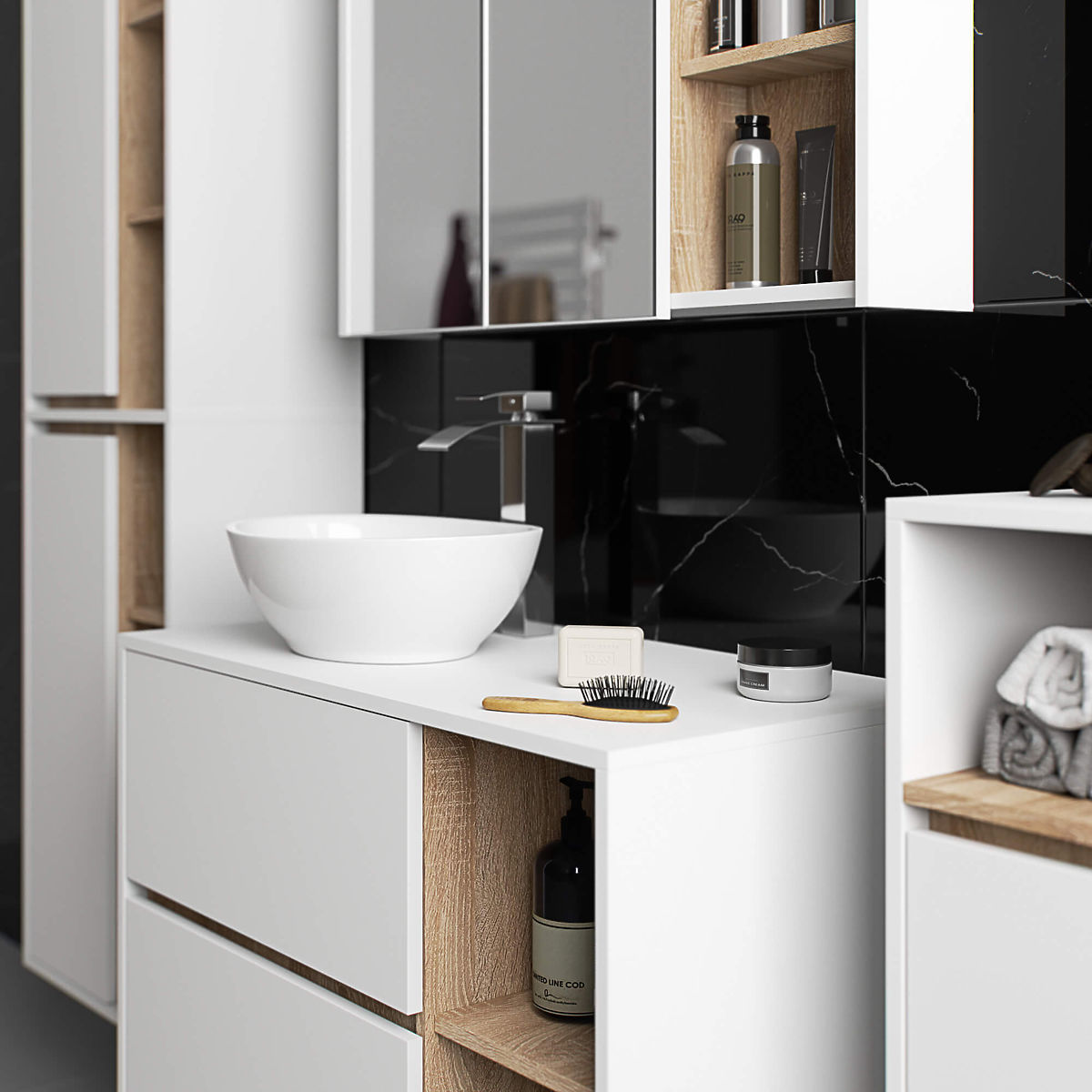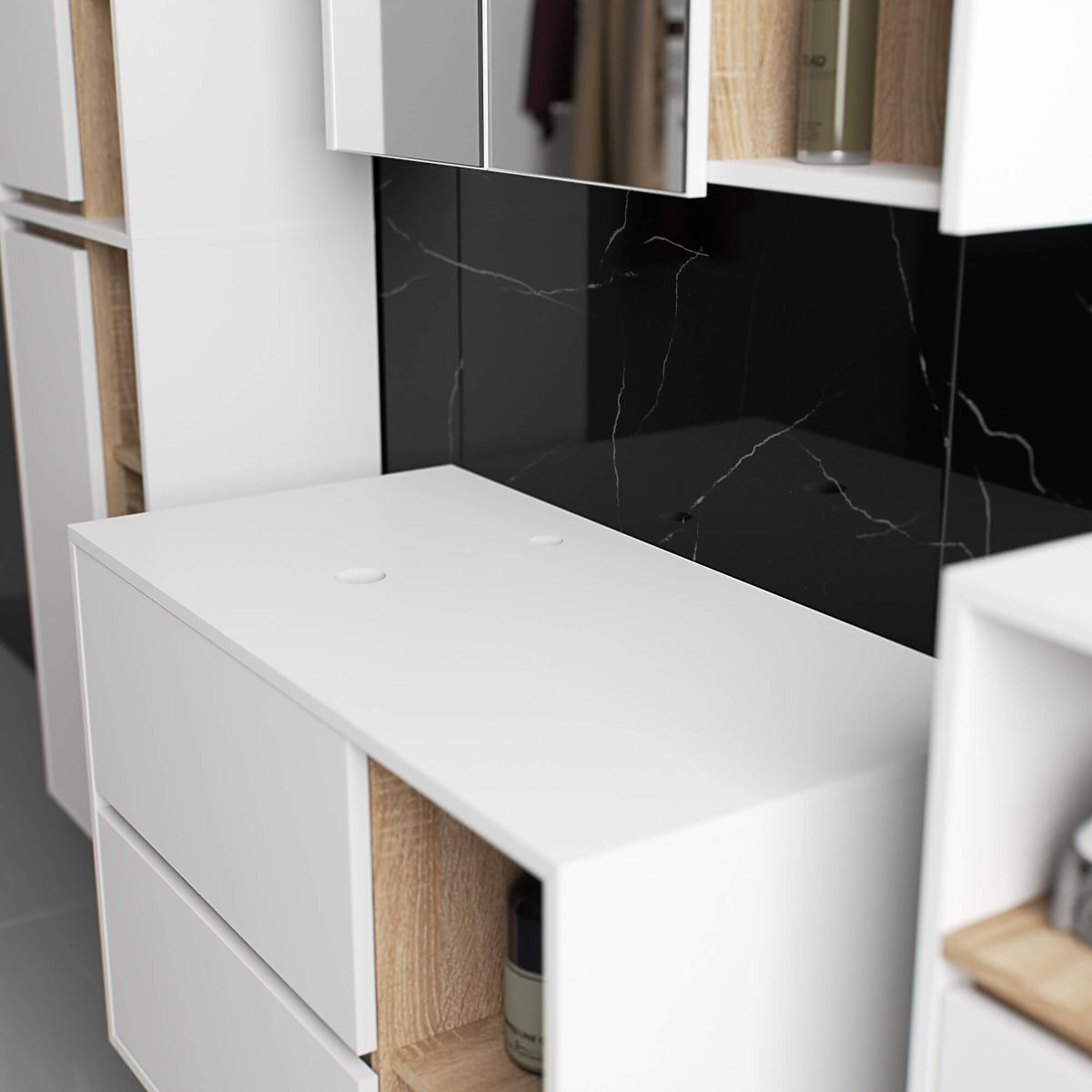 Hängeschrank für das Badezimmer unter dem Waschbecken 90 cm VAMI W90 passt perfekt in ein modernes Interieur. Die Konfiguration mit 2 Schubladen und 2 offenen Regalen bietet großen Komfort bei der Nutzung. In den geräumigen Schubladen können Hygiene- und Kosmetikprodukte aufbewahrt werden, während auf den offenen Regalen z.B. Dekorationen platziert werden können, die dem Interieur eine persönlichere Note verleihen. Dieses Modell des Hängeschranks unter dem Waschbecken hat in der Platte 2 Öffnungen für die Montage des Waschbeckens und des Siphons. Der Schrank hat auch speziell geformte Schubladen, die die Installation des Siphons und der hydraulischen Elemente ermöglichen. ACHTUNG! Möbel werden ohne Waschbecken und Armaturen geliefert.