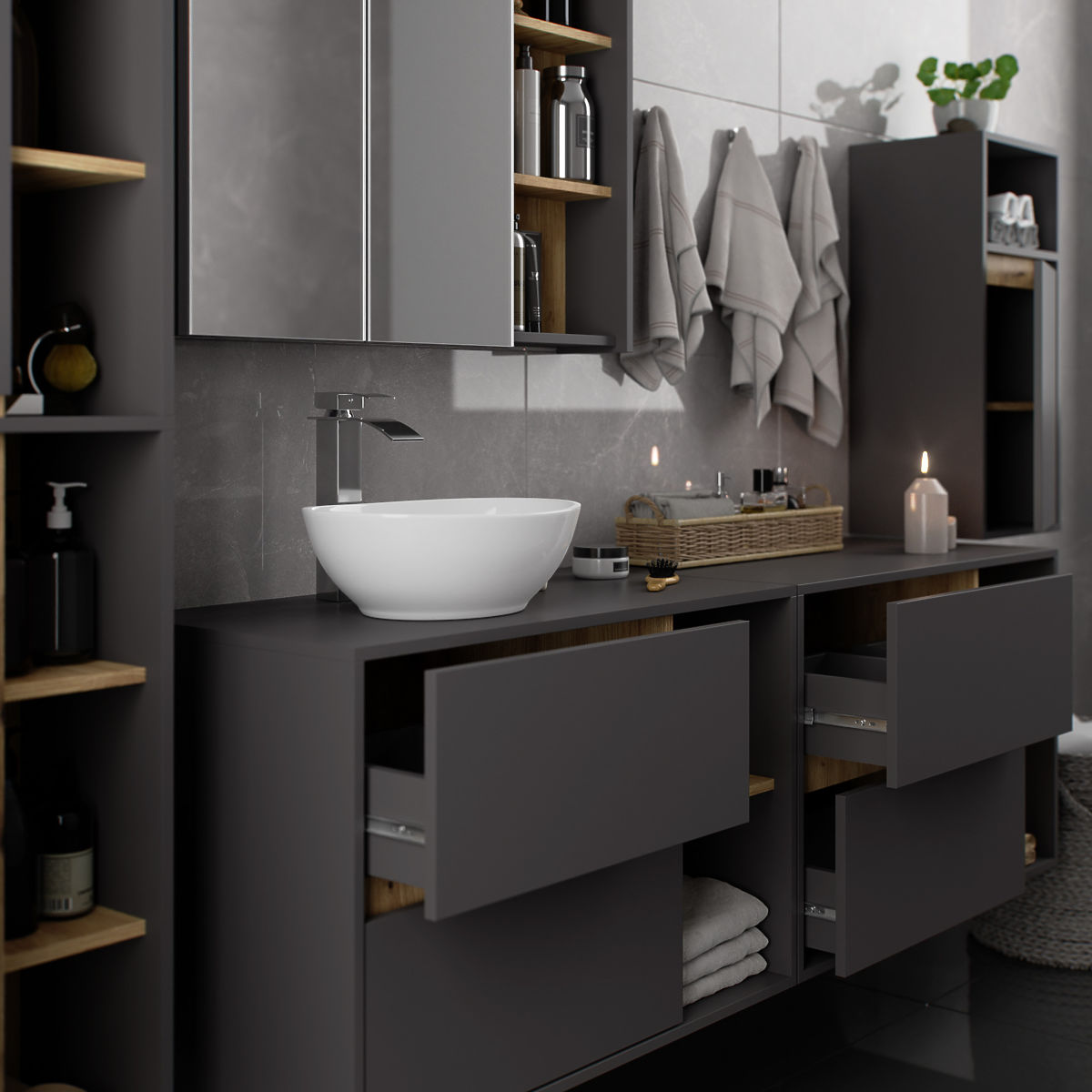 Badezimmerschränke ergänzen die Badezimmereinrichtung hervorragend, bieten den notwendigen Platz für alle Kosmetika und Reinigungsmittel und verleihen dem Badezimmer einen gewissen Stil. Geräumige Schränke erleichtern die Ordnung im Raum, was sich positiv auf die Ästhetik des Innenraums auswirkt. Die VAMI-Kollektion zeichnet sich durch eine auffällige stilvolle Farbgebung aus – Korpus und Fronten haben die gleiche Farbe, während die Innenfarbe unterschiedlich ist.