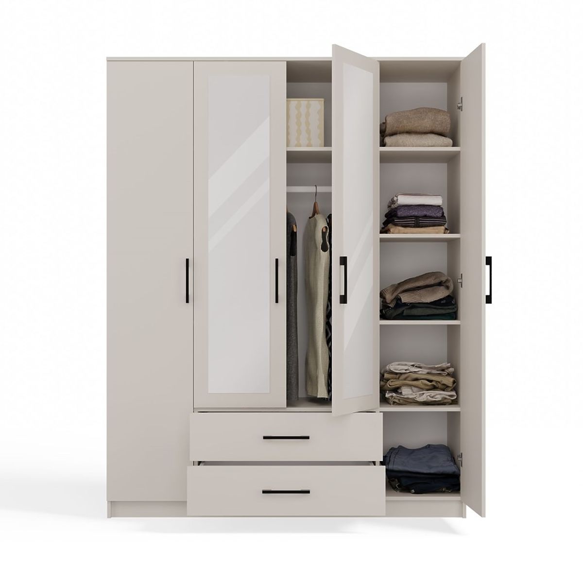 • Doppelte Spiegel: Die Spiegel an den Vorderseiten der Türen vergrößern den Raum optisch und sind zudem ein praktisches Accessoire – ideal für die tägliche Kontrolle des Aussehens.