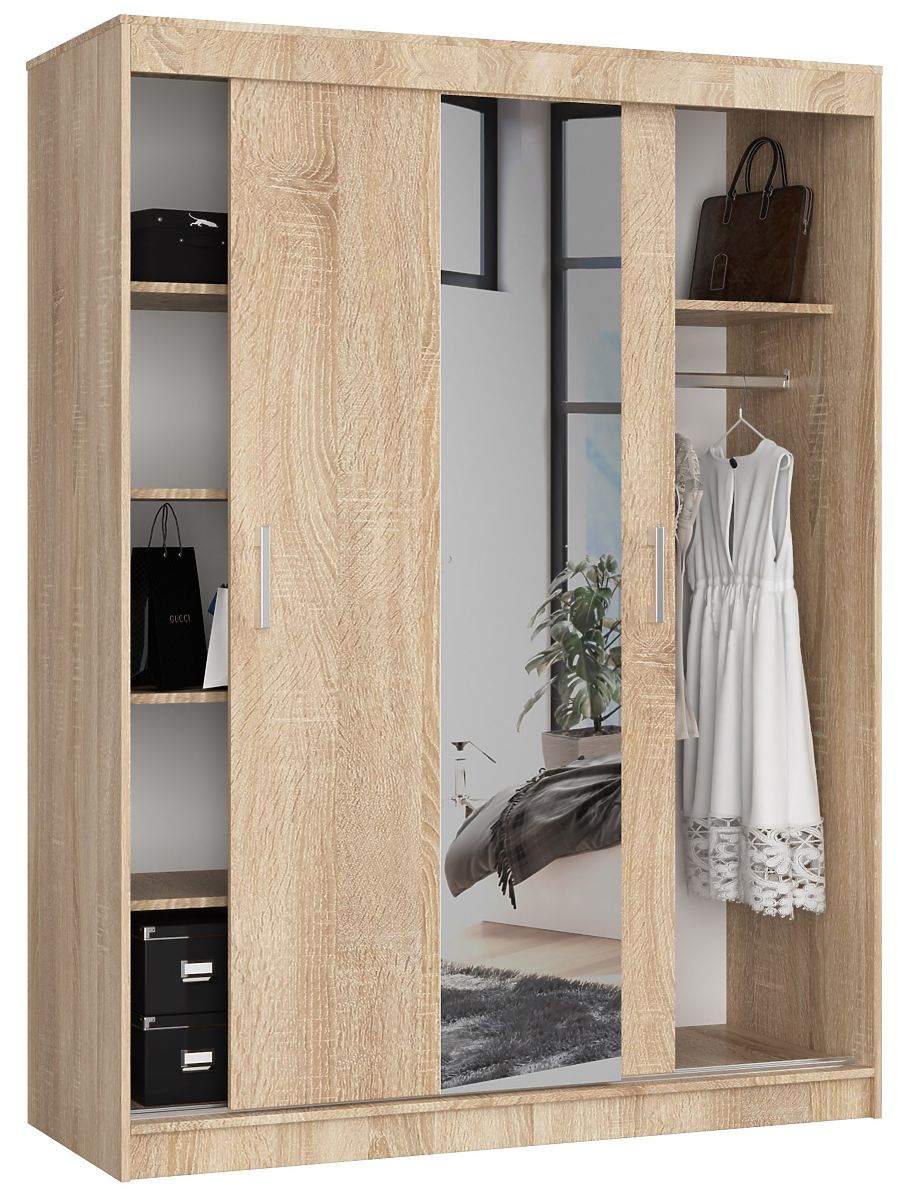 Der Kleiderschrank mit einem Spiegel in der mittleren Sektion des Möbelstücks ist aus hochwertiger, abriebfester Kronospan-Laminatplatte gefertigt. Sowohl der Korpus des Schranks als auch teilweise jede der 2 Türen, die auf Metallschienen gleiten, sind in der warmen Farbgebung der Sonoma Eiche gehalten. Das Innere des Schranks ist funktional in 2 Bereiche unterteilt. Auf der linken Seite befinden sich übereinander geräumige Regale (5 Stück). Der rechte Teil des Schranks bietet Platz zum Aufhängen von Kleidung. Dort ist ein oberes Regal installiert, unter dem eine Metallstange befestigt ist.