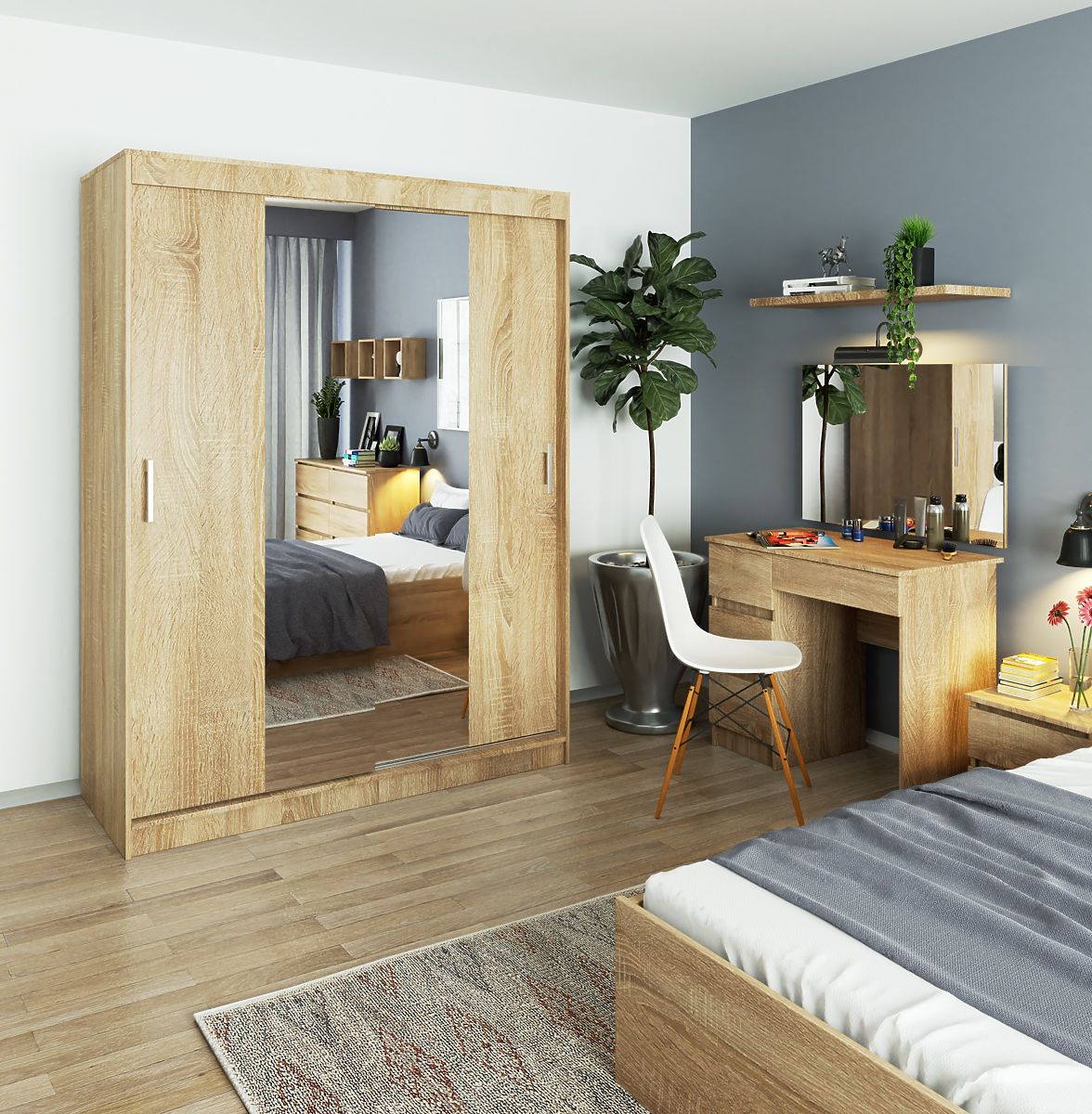 Der geräumige Kleiderschrank in der Farbe Sonoma Eiche mit Schiebetüren und Spiegel ist ein universelles und zeitloses Möbelstück, das seine Funktion in fast jedem Wohnraum erfüllt. Er passt hervorragend in Kinder- und Jugendzimmer sowie in Schlafzimmer oder Ankleidezimmer. In einem entsprechend großen Flur kann er als Schrank für Oberbekleidung und andere notwendige Haushaltsgegenstände dienen.