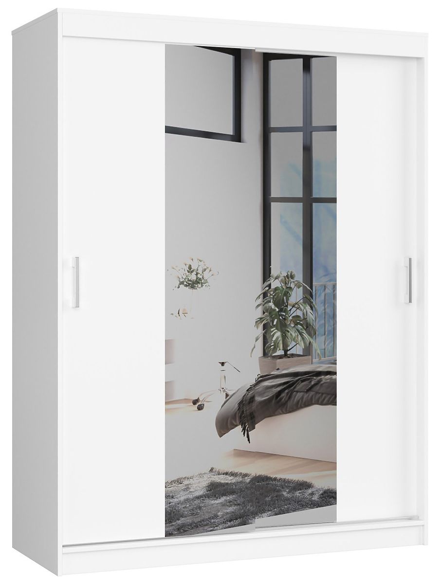 Weißer Schiebetürenschrank 150 cm mit Regalen und Kleiderstange. Große Nutzfläche.