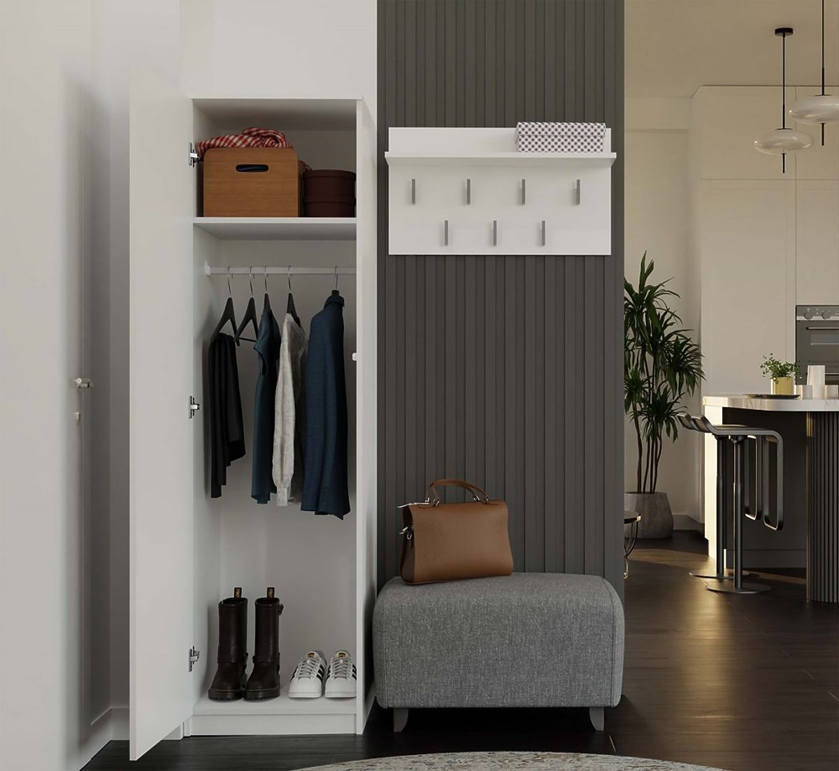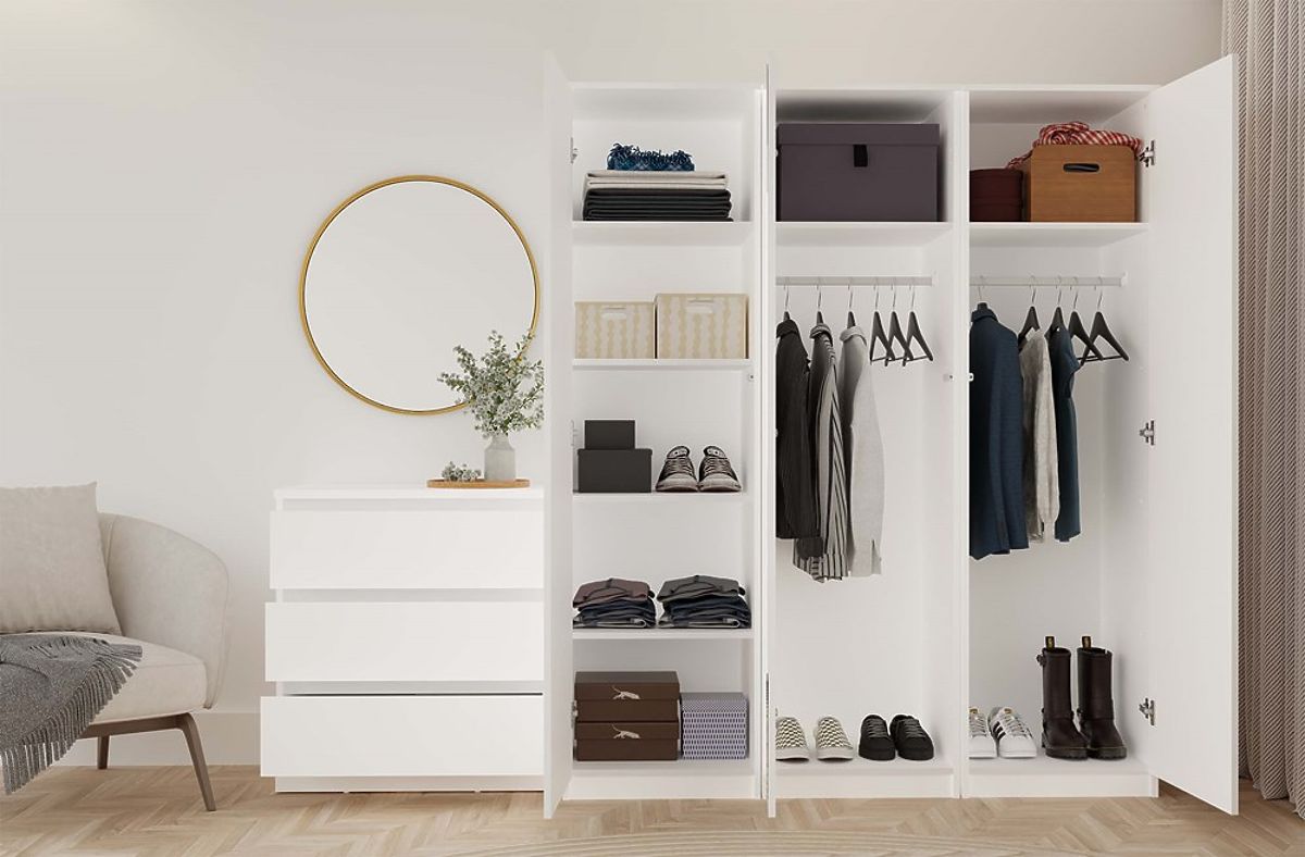 • Multifunktionales Innenleben – Möglichkeit der Anordnung: Kleiderstange oder 4 Regalböden