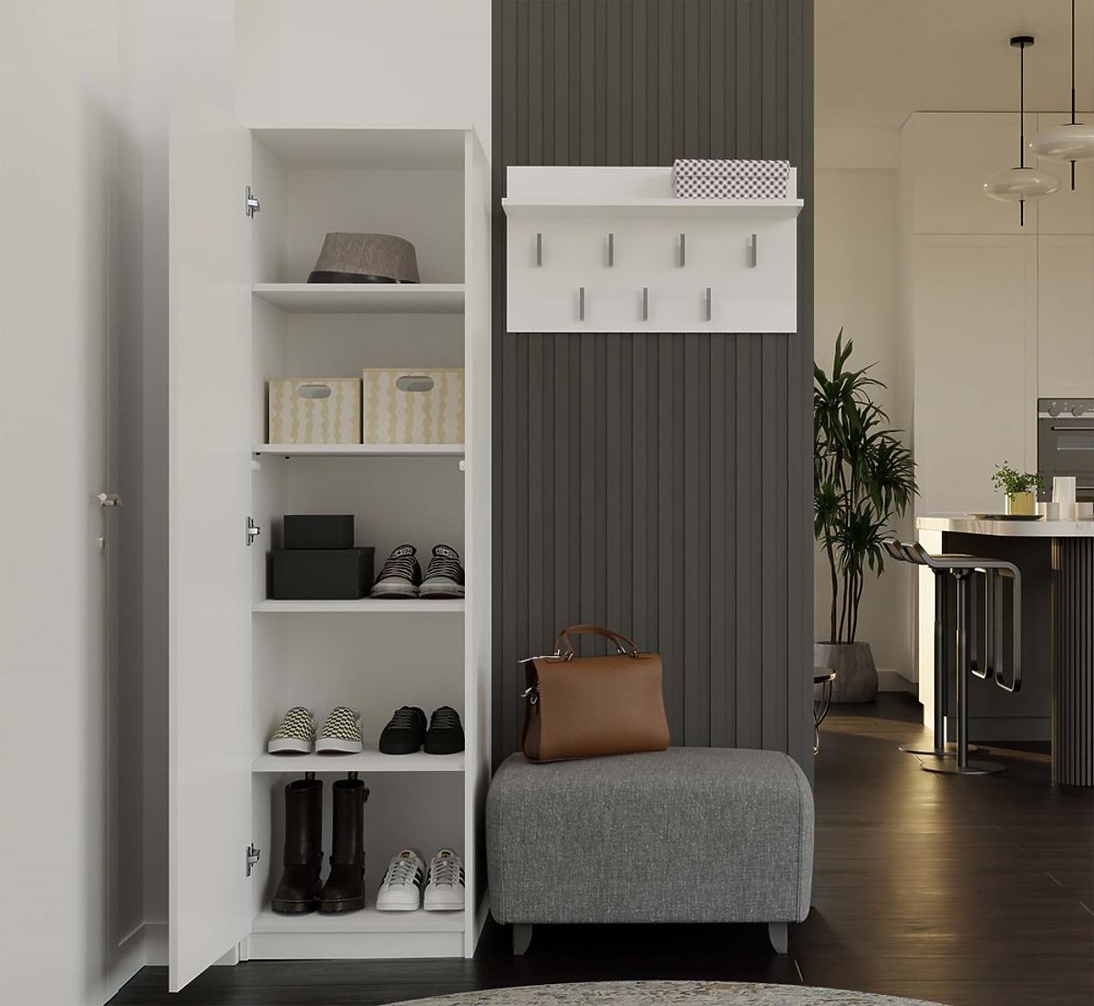 Im Lieferumfang enthalten: 4 Regalböden und 1 Stange – die Anordnung wählen Sie bei der Montage je nach Verwendungszweck.