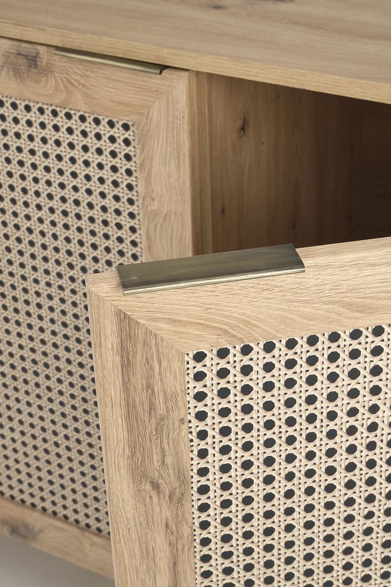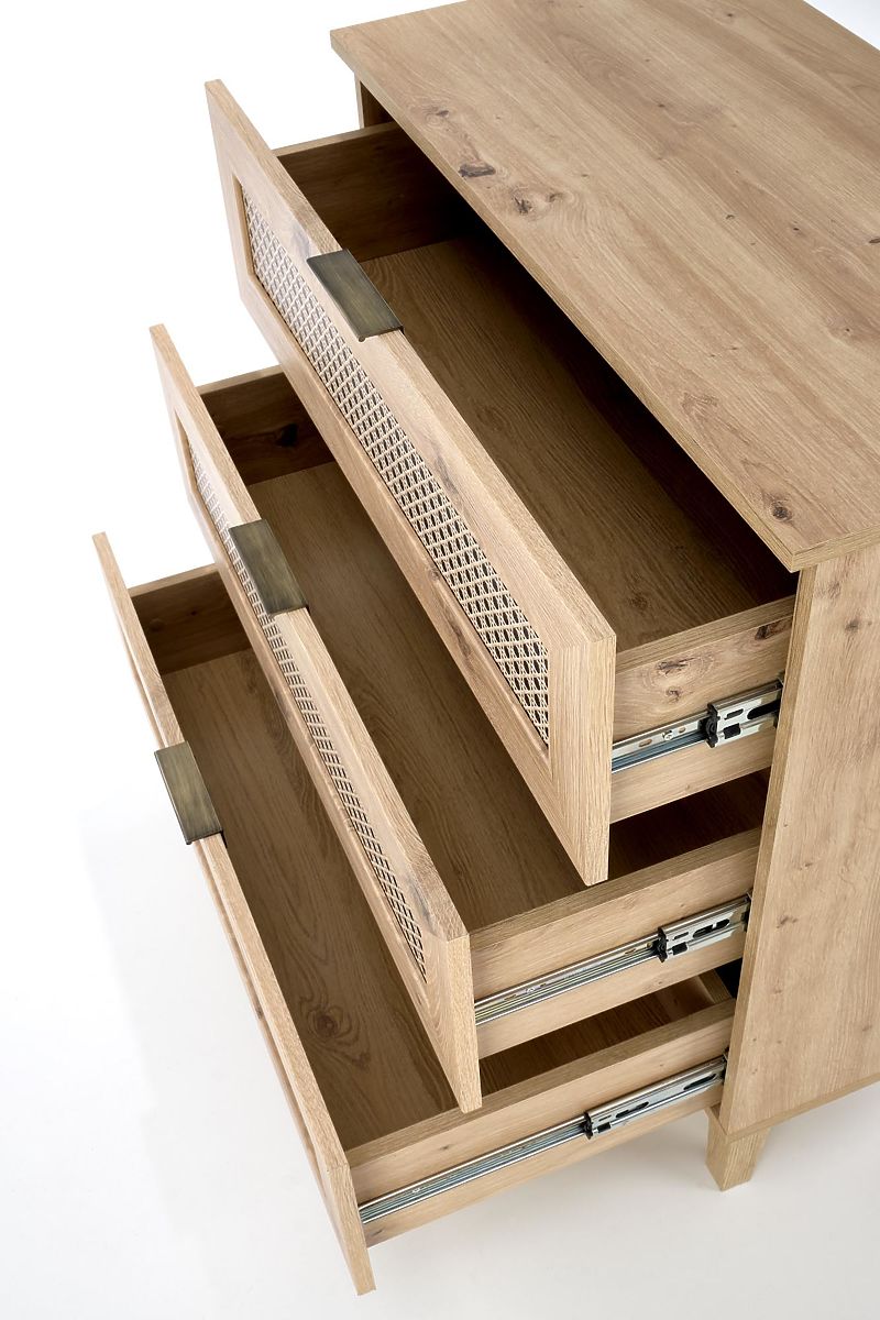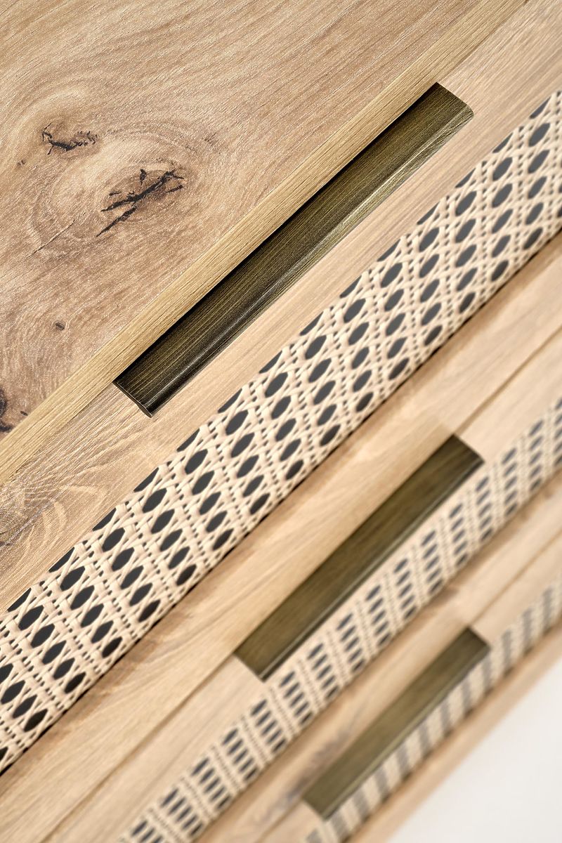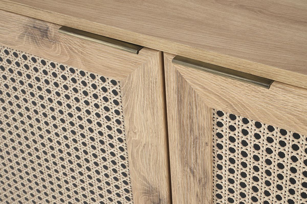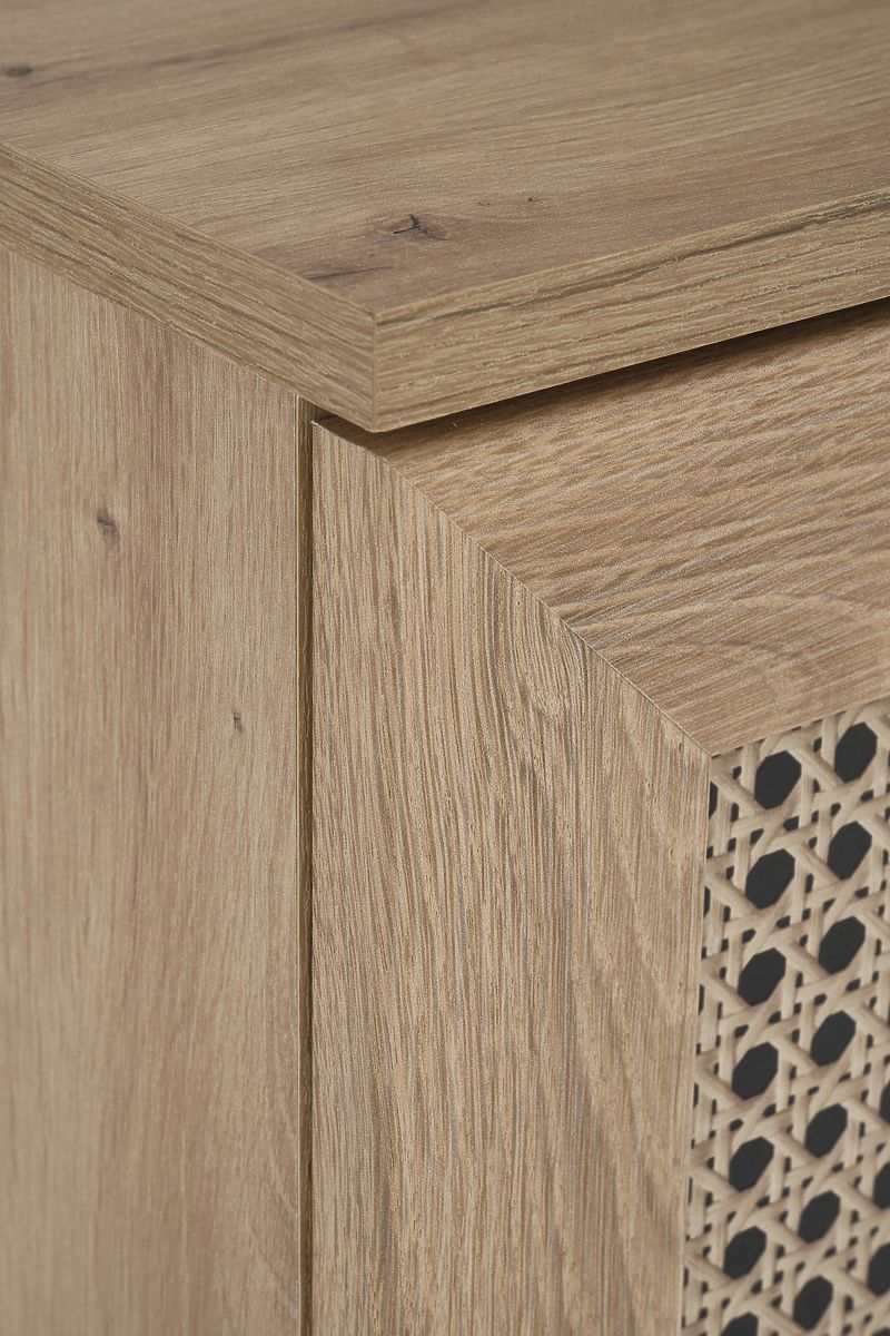 Das Dekor Eiche Artisan zusammen mit modischen Einsätzen im Wiener Geflecht-Muster verleiht der Kommode einen einzigartigen Boho-Touch, der sofort ins Auge fällt.