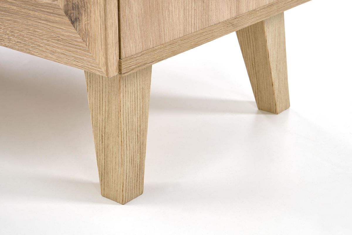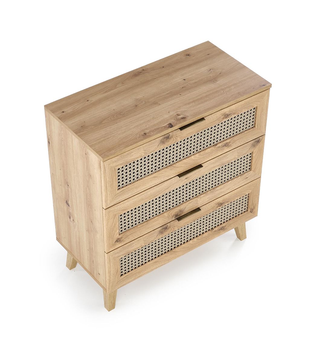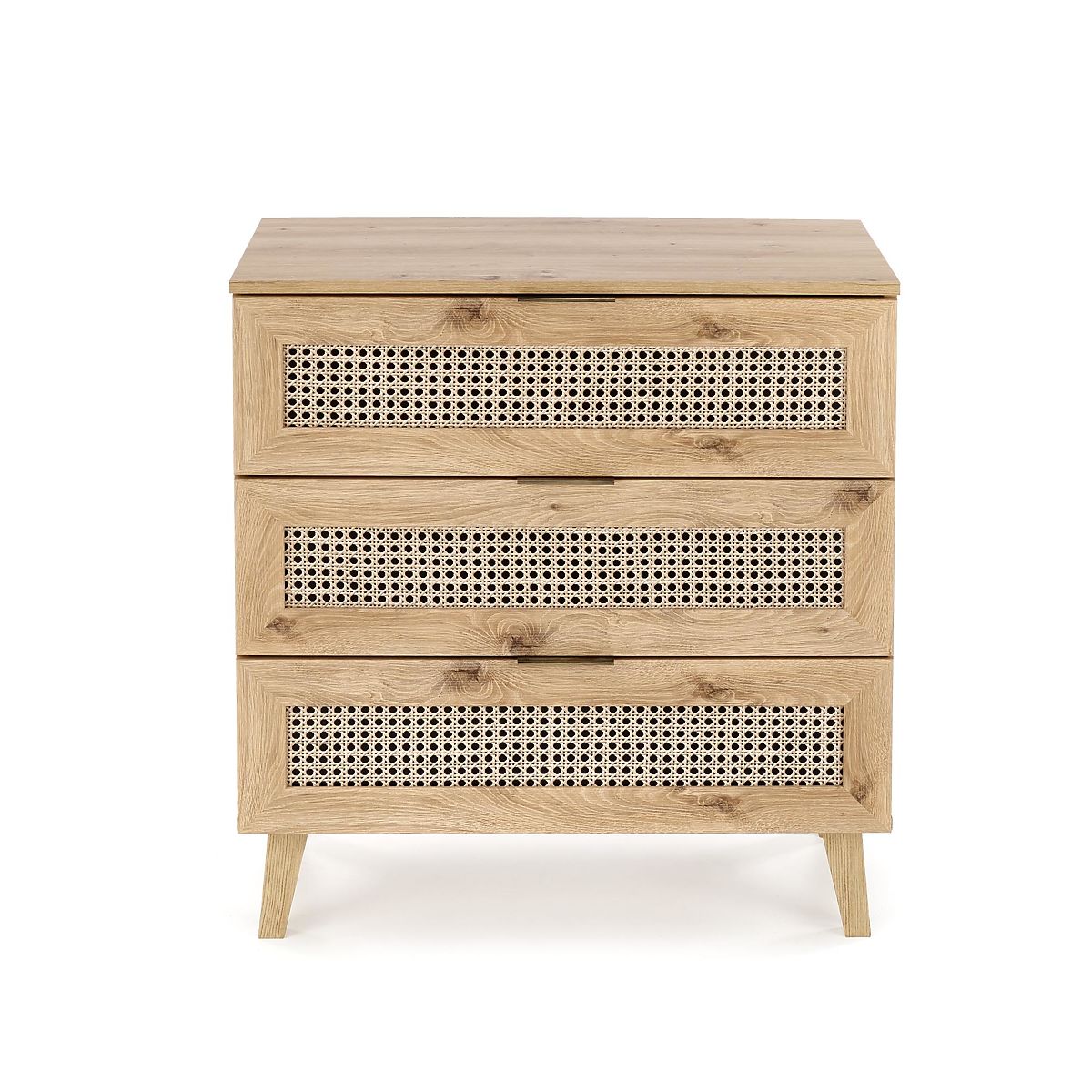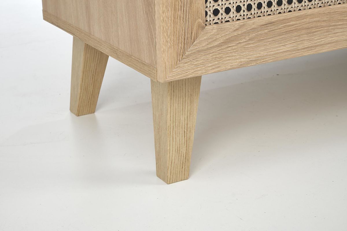 Das Dekor Eiche Artisan zusammen mit modischen Einsätzen im Wiener Geflecht-Muster verleiht der Kommode einen einzigartigen Boho-Touch, der sofort ins Auge fällt.