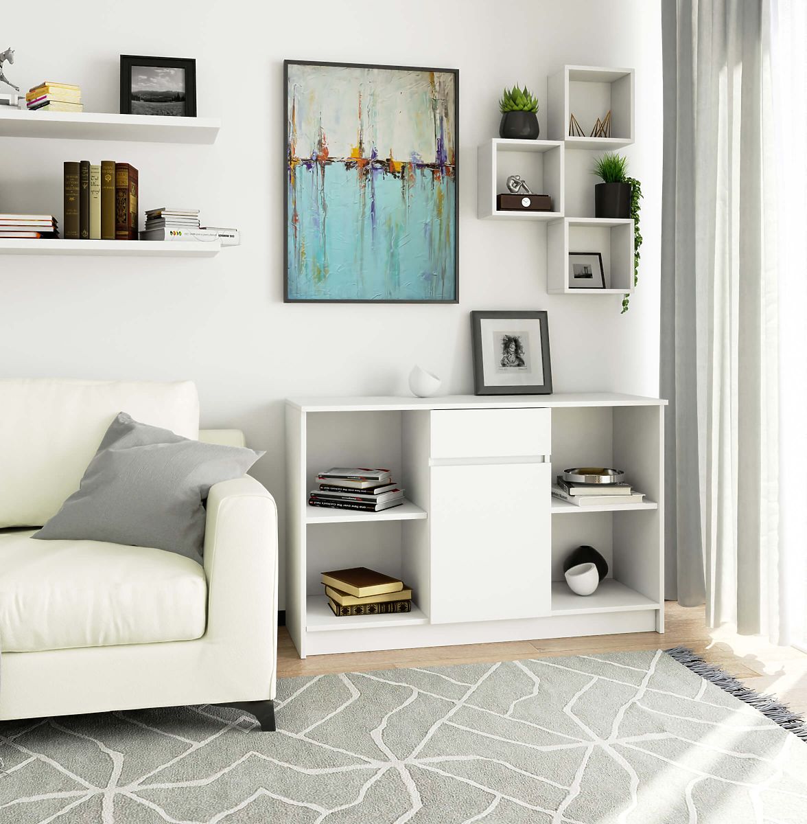 Die weiße Kommode aus der Serie B-17 kann als eigenständiges, unabhängiges Element in jedem Raum dienen. Dank der modularen Konstruktion kann sie mit einem anderen Segment der Serie kombiniert werden, um einen komfortablen Eckschreibtisch zu schaffen (weitere Elemente in Form eines Tisches in unserem Geschäft erhältlich). Der mittlere Teil der Kommode enthält eine Schublade und eine verschließbare Tür, die eine freie Aufbewahrung ermöglichen. Zudem verfügt sie über vier separate, symmetrische Regale mit viel Platz zur Präsentation. Die Kommode mit einer Länge von 120 cm und einer Höhe von 77 cm ist aus laminiertem Holz gefertigt. Die Kommode wurde so entworfen, dass sie in die meisten Räume passt. Sie kann ein interessantes Element des Wohnzimmers sein, als funktionales Möbelstück zur Aufbewahrung im Schlafzimmer dienen und eignet sich auch als zusätzliches Segment in der Küche. Dank der neutralen weißen Farbe und des minimalistischen Designs wird sie zu einem attraktiven und vor allem funktionalen Accessoire in jedem Interieur.