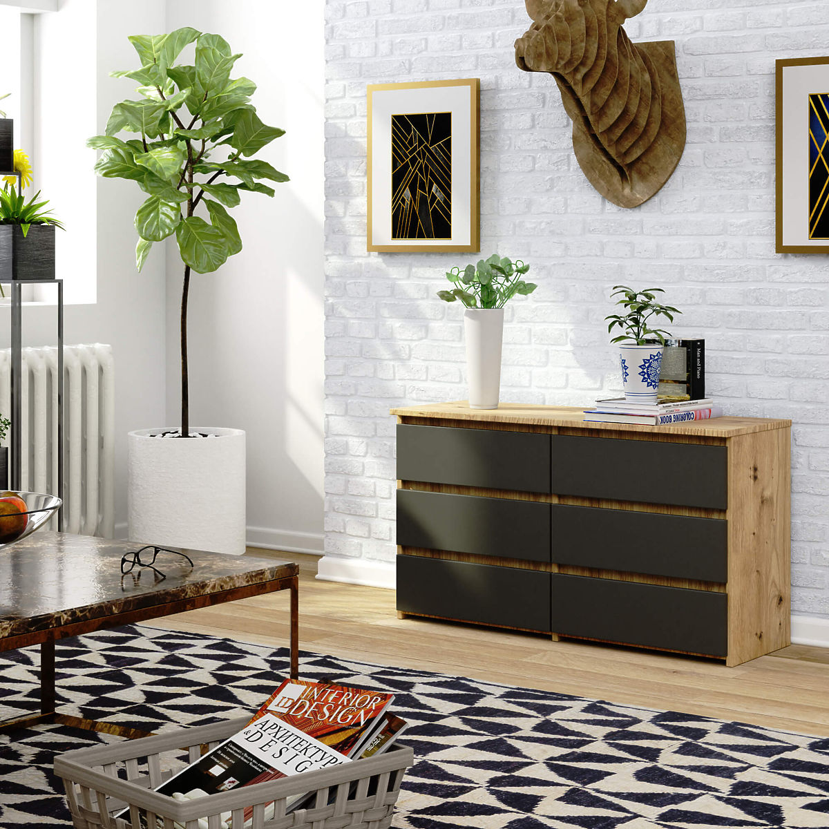 Elegante Kommode mit sechs geräumigen Schubladen in Eiche Artisan und Grau. .. mehr