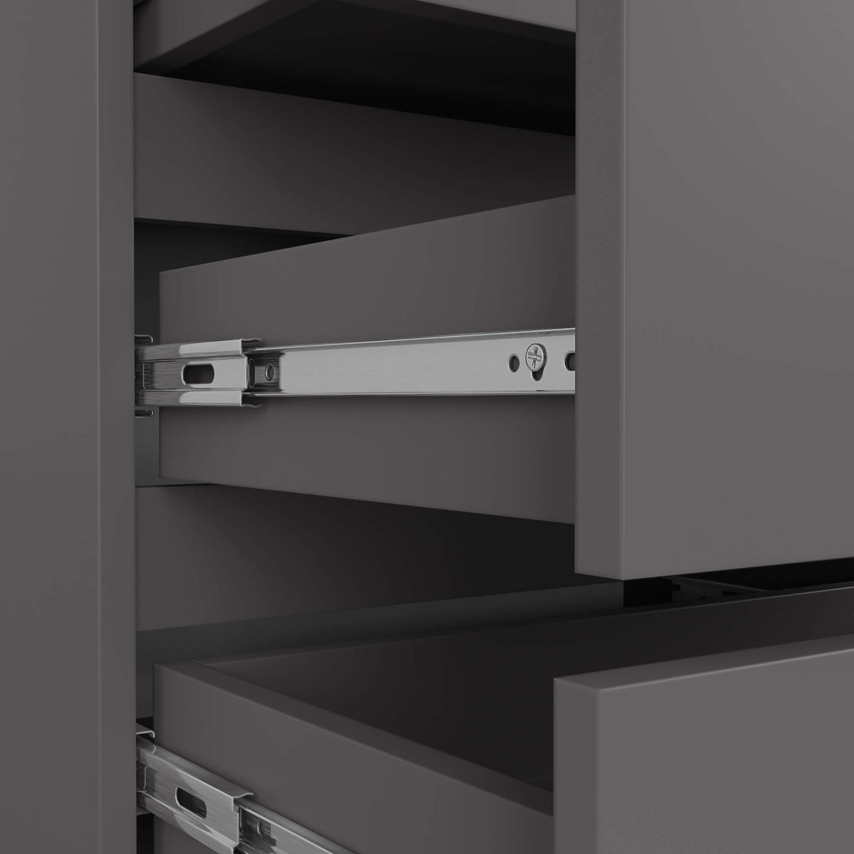 Die Kommode in Graphitgrau verfügt über 3 leicht zu öffnende Schubladen. Sie eignet sich hervorragend als unverzichtbares Element der Schlafzimmerausstattung. In den Schubladen können Wäsche, Kosmetikzubehör oder ein Satz Bettwäsche zum Wechseln aufbewahrt werden. Die Platte ist ideal zum Aufstellen einer Nachttischlampe und zum Ablegen interessanter Lektüre. Das Möbelstück kann auch im Kinderzimmer und im Schlafzimmer eines Teenagers platziert werden.