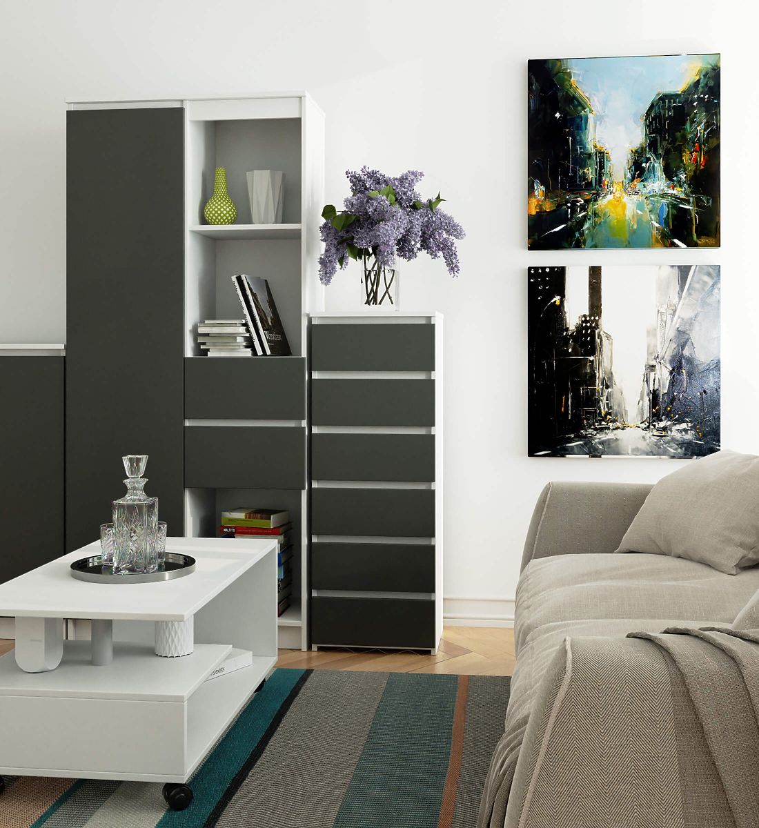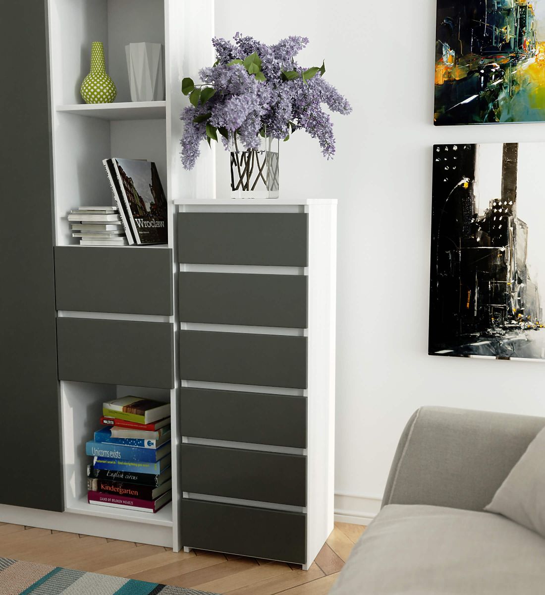 - Elegantes Aussehen - die Kommode ist einfach in der Form, zeichnet sich durch stilvolles Weiß und graue Fronten aus,
