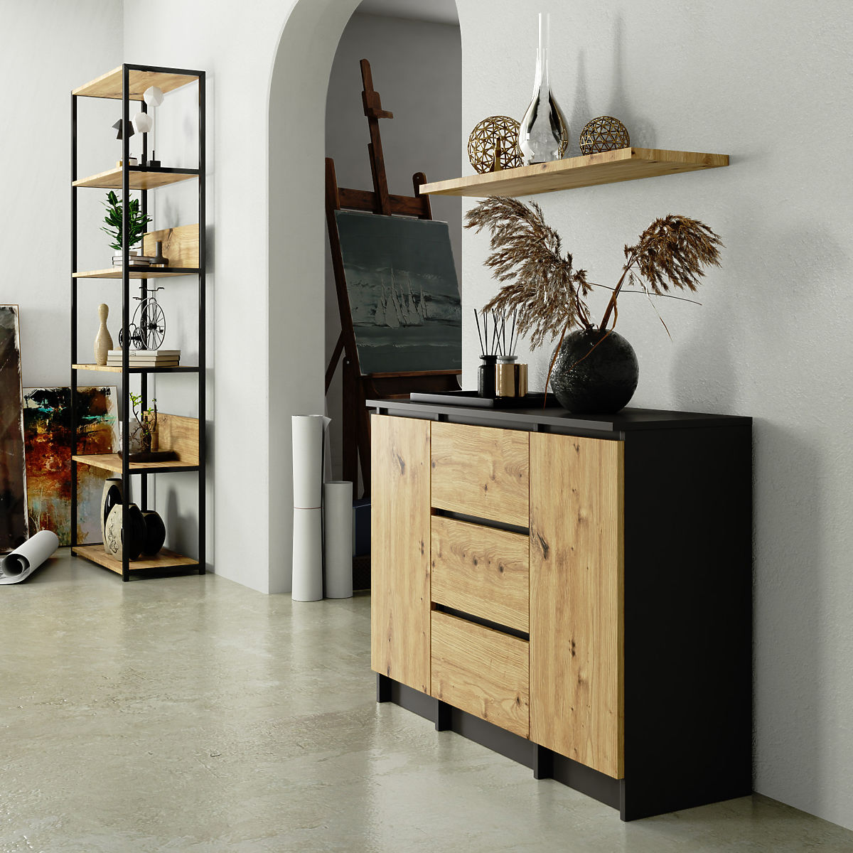 Kommode mit 3 Schubladen und 2 Türen, Graphit Grau/Eiche Artisan. .. mehr