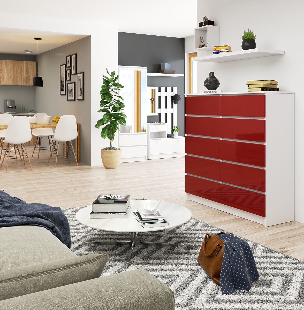 Die Kommode in Weiß / rotem Glanz ist ein Möbelstück, das gut vor einem Hintergrund aus Weiß, Marineblau, Grau und Cappuccino aussieht, aber mutigere können es mit energetischem Orange, Flaschengrün oder tiefem Violett kombinieren. Das Möbelstück passt hervorragend in Wohnzimmer, Schneider- und Handwerkswerkstätten, in moderne Büros, die in einem gewagten Stil mit Charme eingerichtet sind. Es kann auch erfolgreich in klassische Arrangements integriert werden.
