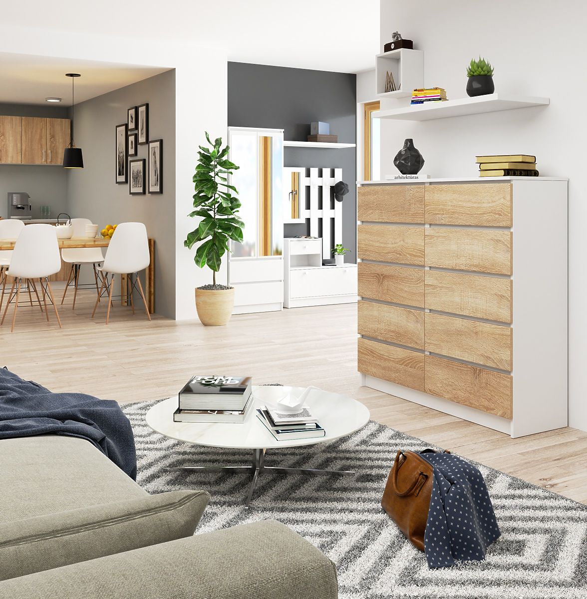 Kommoden sind funktionale Möbel, ohne die man sich das Wohnen kaum vorstellen kann. Sie ermöglichen die Organisation von Textilien und anderen Gegenständen. Manchmal gibt es wirklich viele davon. In einem solchen Fall lohnt es sich, die weiße Kommode K 120 cm mit Schubladenfronten in Sonoma-Farbe zu wählen - sie enthält bis zu 10 Schubladen, was viel freien Raum zur Nutzung bietet. Am besten im Wohnzimmer, Schlafzimmer oder Flur platzieren.