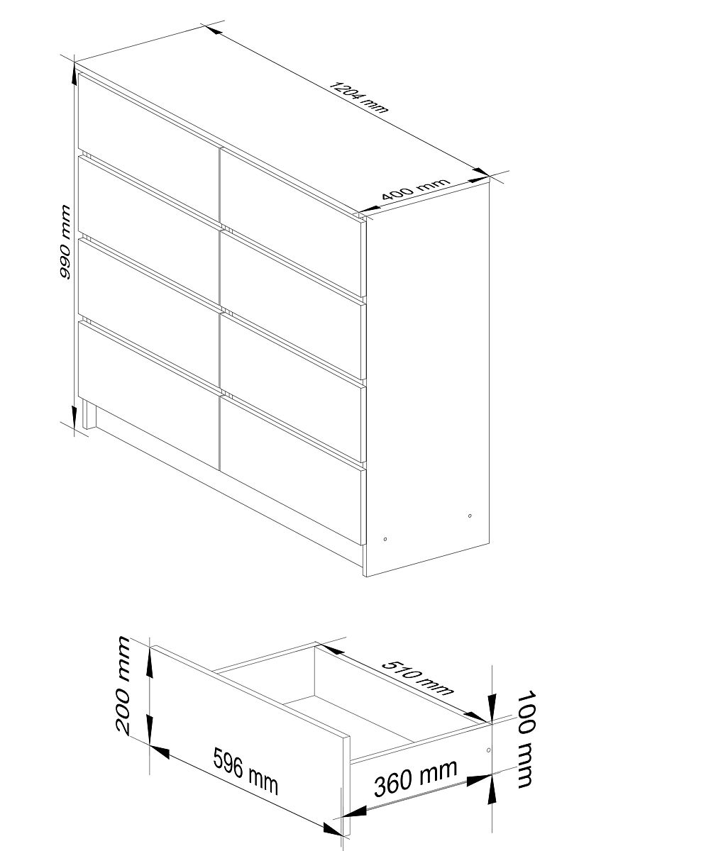 Hergestellt aus 16mm laminierten Platten der Firma Kronospan. Die Kanten der Kommode sind mit ABS-Kante versehen, die die Widerstandsfähigkeit der Kommode gegen Beschädigungen erhöht.