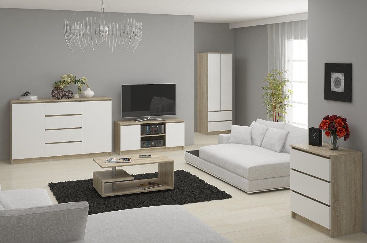 Wenn Sie nach geeigneten Möbeln sowohl für das Büro als auch für den Wohnbereich suchen, die beim Verstauen einer großen Menge notwendiger Dinge helfen, empfehlen wir Ihnen, sich unser Angebot genauer anzusehen. Wir bieten die Kommode K140, bestehend aus vier Schubladen, zwei verschließbaren Schränken und einer langen Platte mit einer Länge von 140 Zentimetern. Ein praktisches, modern gestyltes und preislich attraktives Produkt, das Liebhaber einfacher, aber eleganter Lösungen sicherlich erfreuen wird. Die Kommode ist aus hochwertigen, kratzfesten und robusten Materialien sehr sorgfältig gefertigt. Sie kombiniert eine modische Farbgebung, die Weiß und Eiche Sonoma verbindet. Wir empfehlen den Kauf sowie die Betrachtung weiterer Ausstattungselemente, die in dieser Kollektion erhältlich sind.