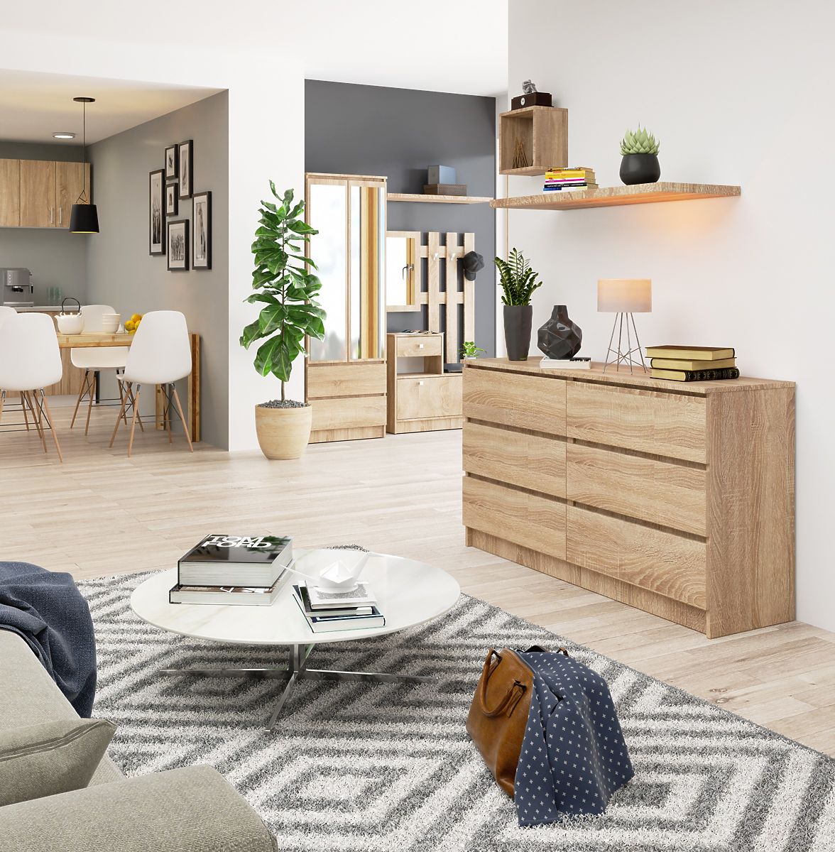 Sechs praktische Schubladen, eine lange Platte und eine Farbe, die bei Menschen, die leicht zu reinigende, universelle und zeitlose Möbel bevorzugen, sehr beliebt ist - das sind die Eigenschaften, die die Kommode K140 in der Farbe Eiche Sonoma charakterisieren. Dieses Angebot verdient Aufmerksamkeit vor allem wegen seines Designs und seiner außergewöhnlichen Funktionalität, aber es lohnt sich auch, auf die hohe Qualität und die sorgfältige Verarbeitung der Möbel zu achten, die sowohl in Büroräumen als auch im Wohnzimmer, Esszimmer, Schlafzimmer oder vielen anderen Wohnräumen erfolgreich eingesetzt werden können. Die solide Verarbeitung aus langlebigen Materialien wird sicherlich auch die anspruchsvollsten Kunden schätzen, für die der günstige Preis der Möbel ebenfalls ein Vorteil sein wird.