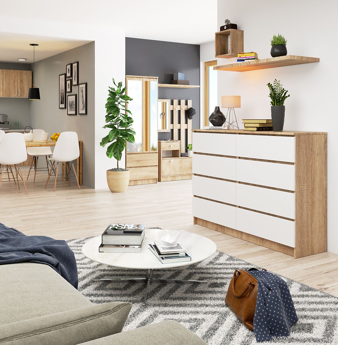 Kommode K140 mit 8 geräumigen Schubladen in modernem Sonoma-Weiß-Design. .. mehr