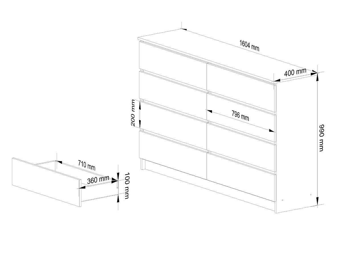 KOMMODE K 160 cm 8 SCHUBLADEN Hergestellt aus 16 mm abriebfestem laminiertem Plattenmaterial.