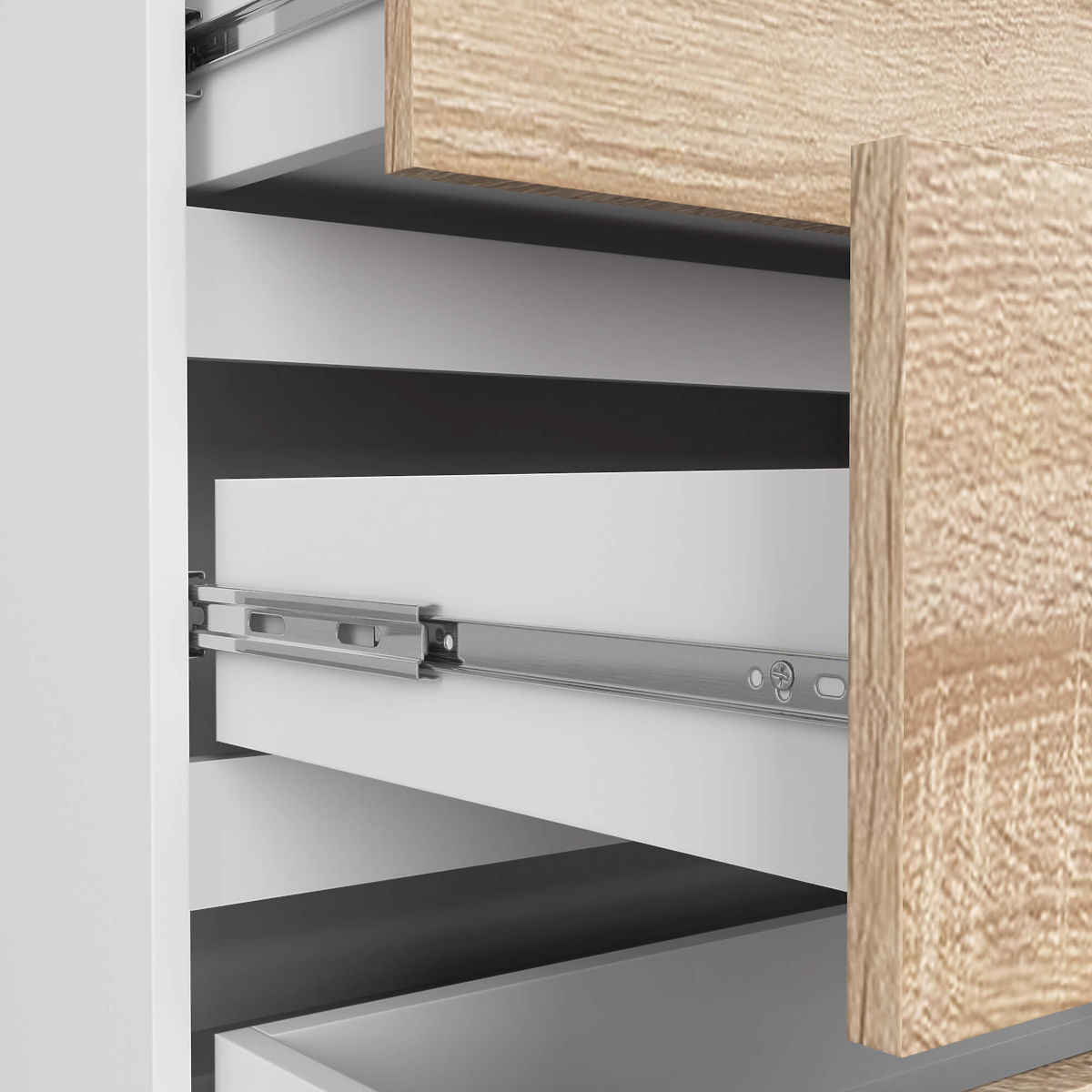 - Schubladen bewegen sich auf Metallkugelführungen