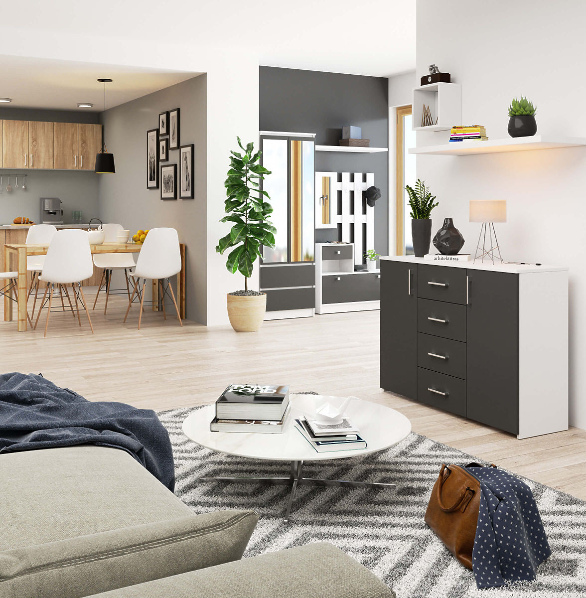 Die Kommode in Weiß / Graphitgrau ist ein großes und geräumiges Möbelstück mit vielen nützlichen Funktionen. Auf beiden Seiten der Kommode befinden sich Türen, hinter denen sich 4 tiefe Regale befinden. Die Mitte des Möbels ist ebenfalls sehr funktional gestaltet, da sie mit 4 tiefen Schubladen ausgestattet ist. Die Kommode bietet also viel Stauraum.