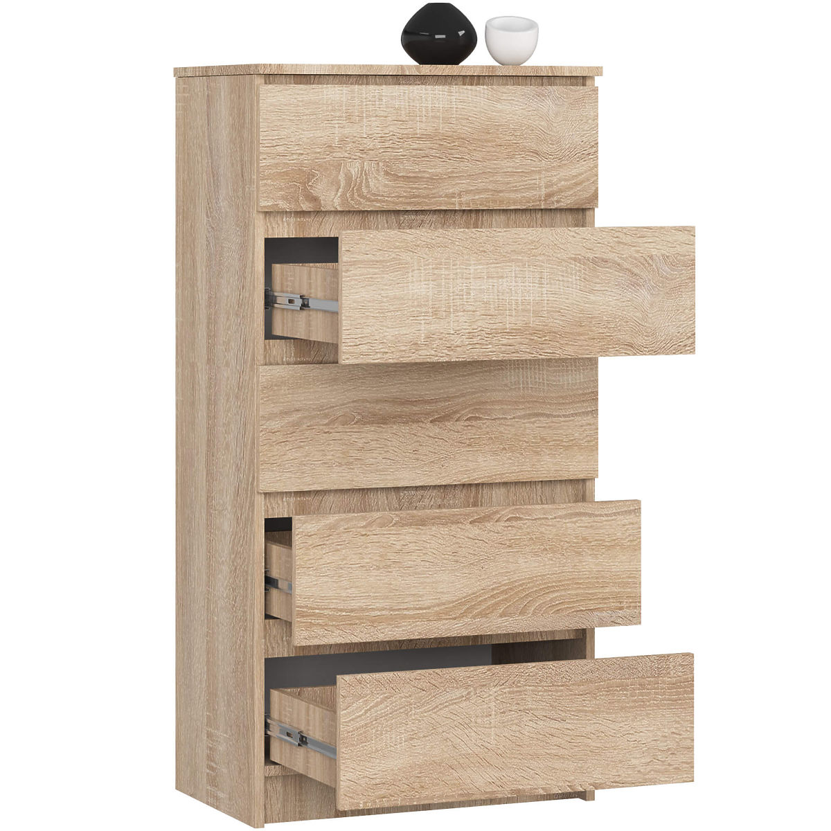 Das Exemplar in der schönen Farbe Sonoma verfügt über fünf geräumige Schubladen, die auf langlebigen Kugelführungen arbeiten. Die Schubladen lassen sich sehr sanft herausziehen und hineinschieben. Die Kommode hat genau 60 Zentimeter Länge, die Höhe des Modells beträgt 121 Zentimeter, während die Tiefe 40 Zentimeter misst. Die bei der Herstellung verwendete laminierte Platte ist 16 Millimeter dick, ABS-Kanten erhöhen die Haltbarkeit und verlängern die Lebensdauer der Möbel. Das Gesamtgewicht der in unserem Angebot verfügbaren Kommode beträgt genau 36 Kilogramm.